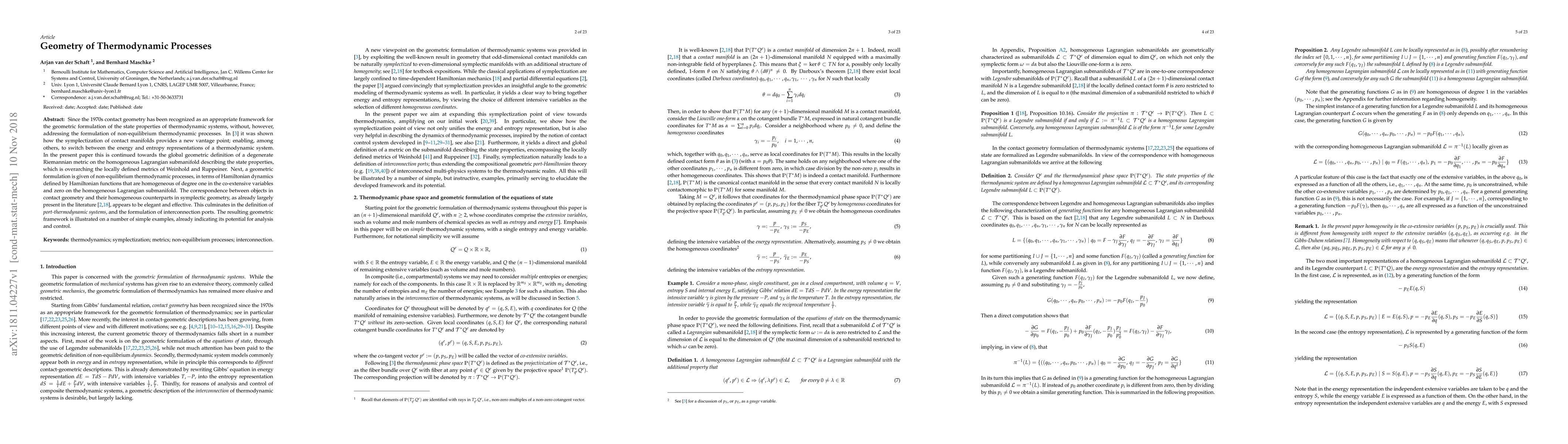 This paper extends the geometric formulation of thermodynamic systems using contact geometry to include non-equilibrium processes, defining a degenerate Riemannian metric on Lagrangian submanifolds and introducing Hamiltonian dynamics for process modeling. The framework also includes the concept of port-thermodynamic systems and interconnection ports.