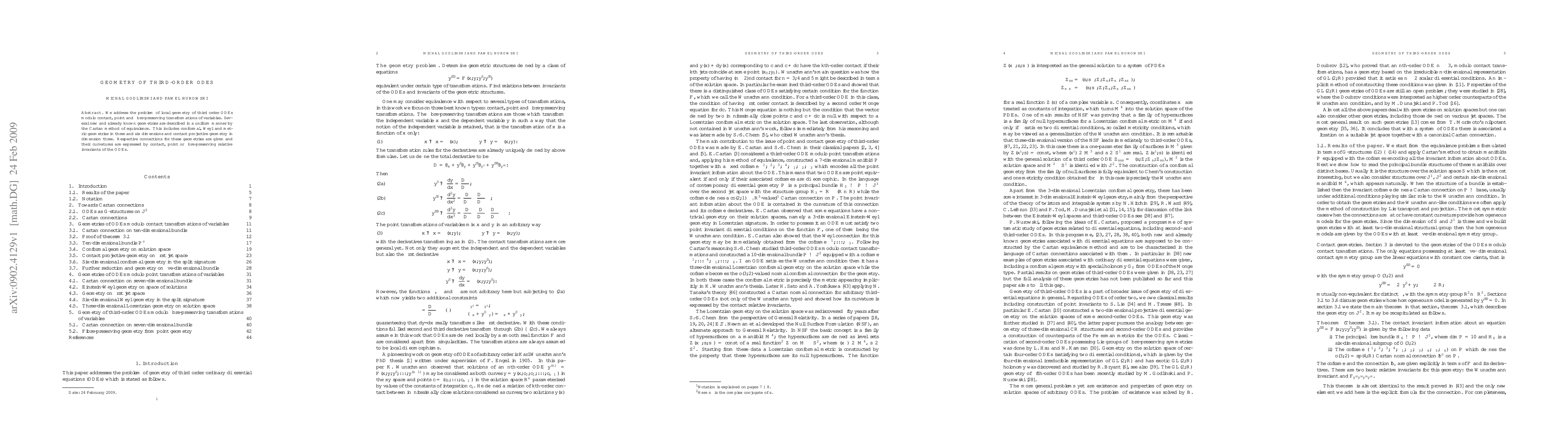 The paper explores the local geometry of third-order ordinary differential equations (ODEs) under contact, point, and fibre-preserving transformations using Cartan's equivalence method, describing various geometries like conformal, Weyl, metric, and contact projective geometries, and expressing their curvatures in terms of relative invariants.