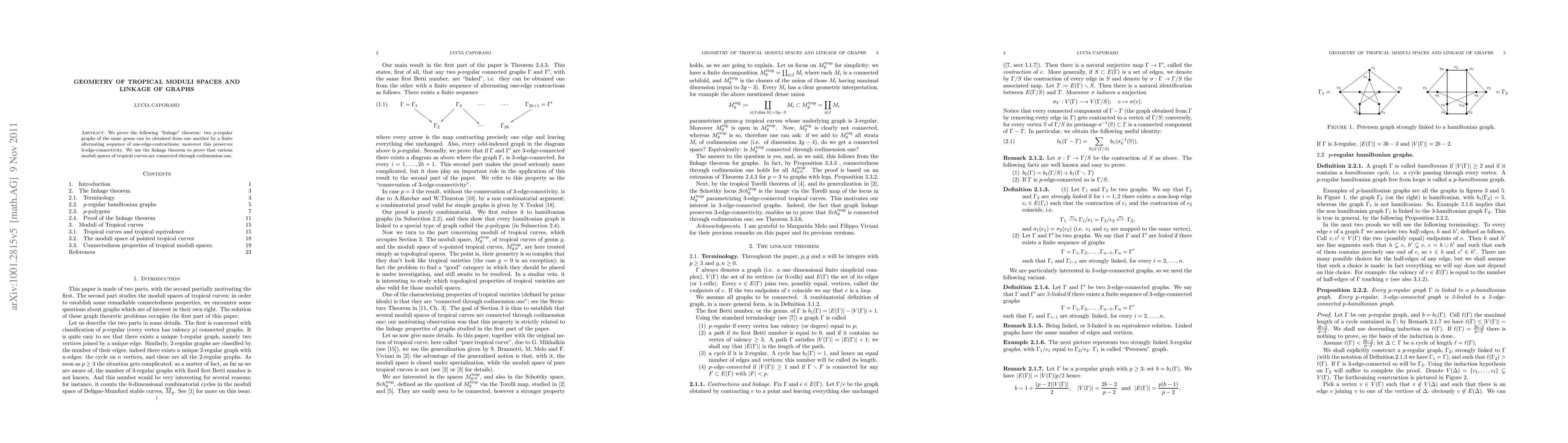We prove the following "linkage" theorem: two p-regular graphs of the same genus can be obtained from one another by a finite alternating sequence of one-edge-contractions; moreover this preserves 3-edge-connectivity. We use the linkage theorem to prove that various moduli spaces of tropical curves are connected through codimension one.