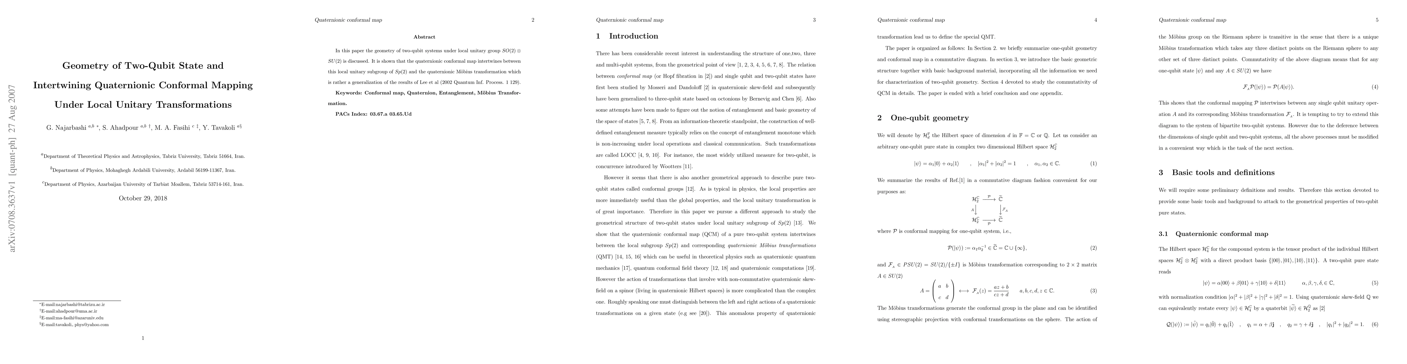 This paper explores the geometry of two-qubit states under local unitary transformations defined by the group $SO(2)\otimes SU(2)$. It demonstrates the intertwining role of quaternionic conformal mappings between this subgroup and quaternionic M\"obius transformations, extending prior results from Lee et al (2002).
