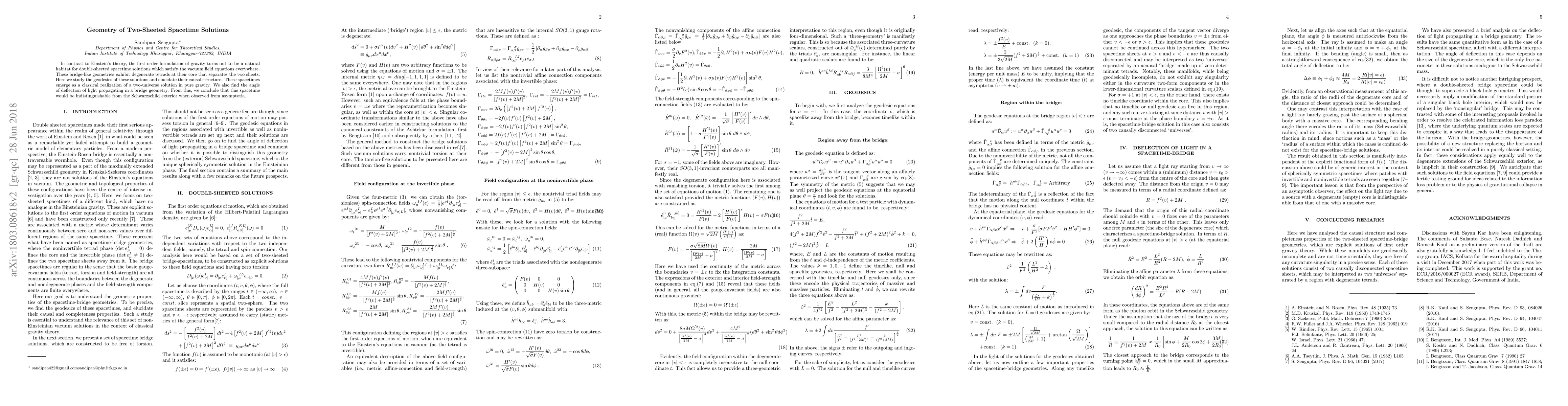 In contrast to Einstein's theory, the first order formulation of gravity turns out to be a natural habitat for double-sheeted spacetime solutions which satisfy the vacuum field equations everywhere. These bridge-like geometries exhibit degenerate tetrads at their core that separates the two sheets. Here we study the geodesics of these solutions and elucidate their causal structure. These spacetimes emerge as a classical realization of a two-universe solution in pure gravity. We also find the angle of deflection of light propagating in a bridge geometry. From this, we conclude that this spacetime would be indistinguishable from the Schwarzschild exterior when observed from asymptotia.