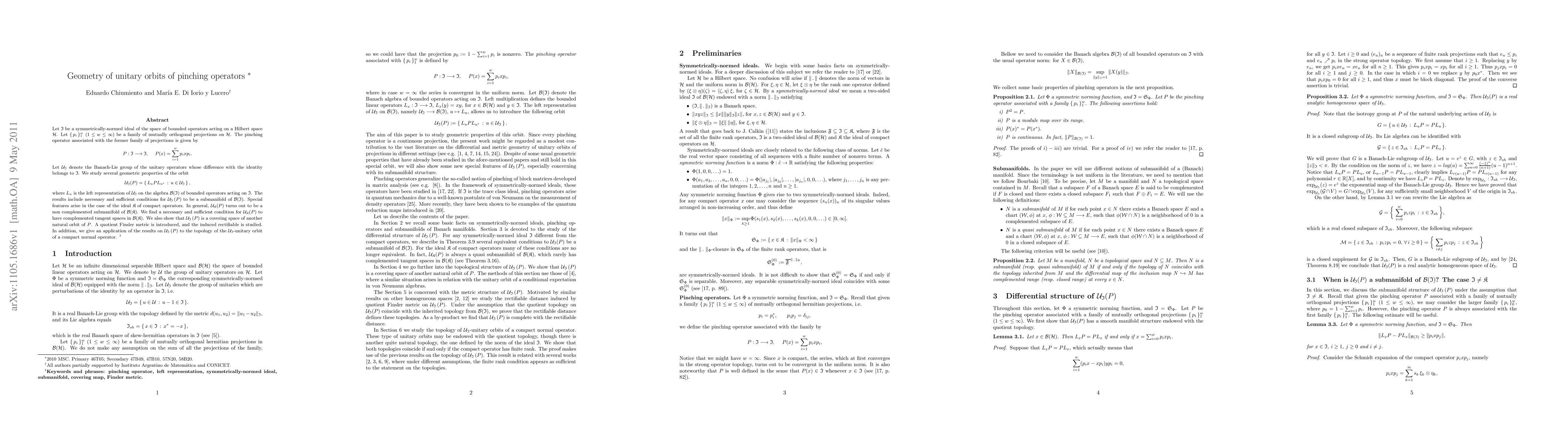 This paper investigates geometric properties of unitary orbits of pinching operators in Hilbert spaces, focusing on necessary and sufficient conditions for these orbits to be submanifolds and their relationship with compact operator ideals.