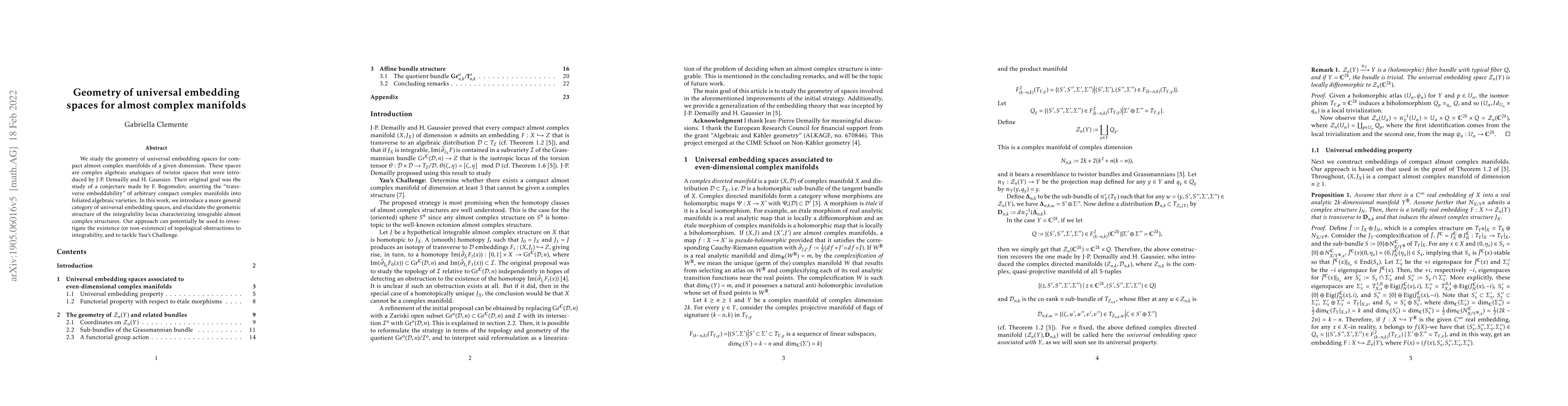 This paper explores the geometry of universal embedding spaces for compact almost complex manifolds, introducing a broader category of these spaces and analyzing their integrability locus. The study aims to investigate potential topological obstructions to the integrability of almost complex structures, extending previous work on the conjecture of "transverse embeddability" by Bogomolov.