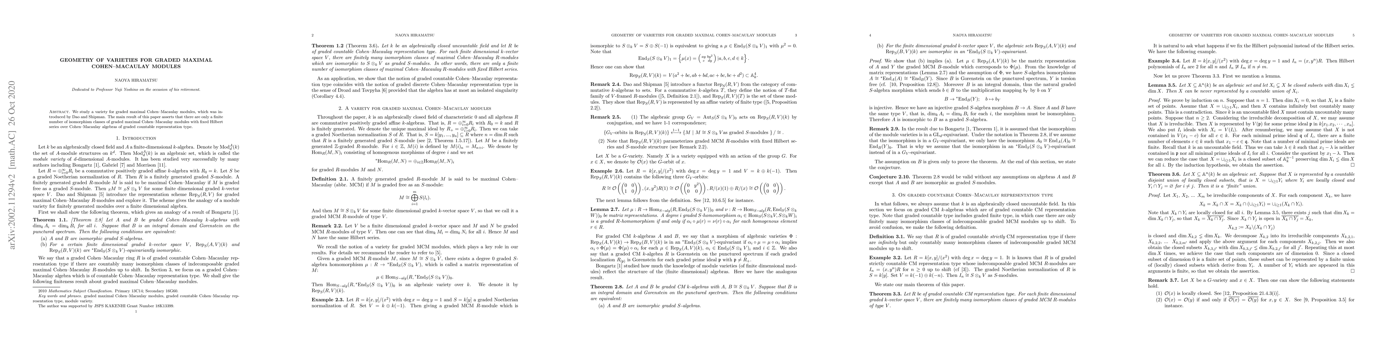 This paper investigates the variety of graded maximal Cohen-Macaulay modules introduced by Dao and Shipman, concluding that only a finite number of isomorphism classes exist for modules with a fixed Hilbert series over Cohen-Macaulay algebras of graded countable representation type.