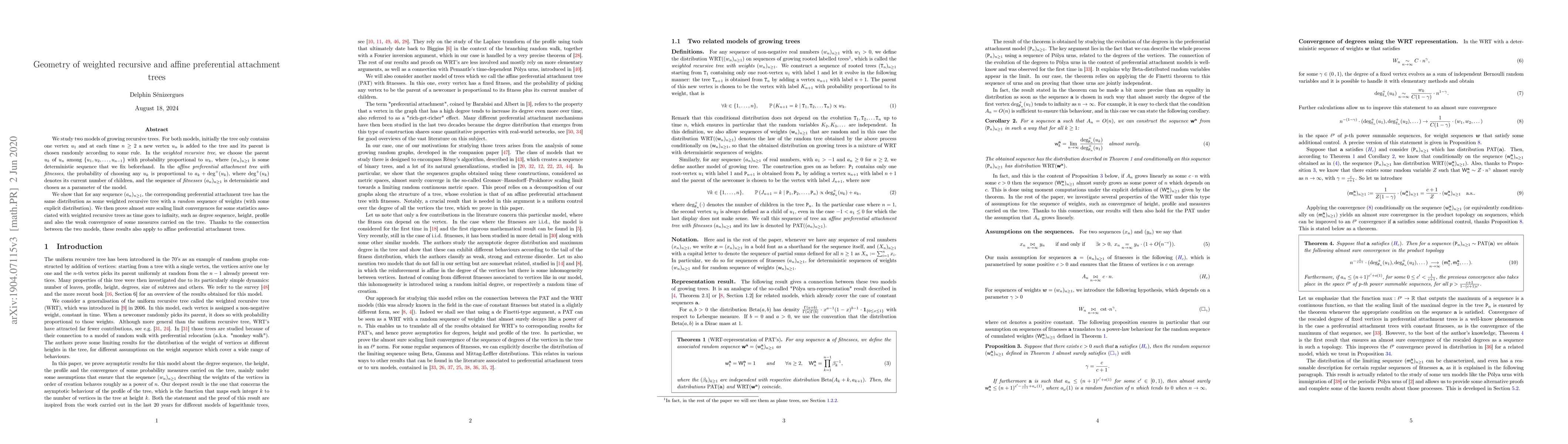 This paper investigates two growing tree models: weighted recursive trees and affine preferential attachment trees. It shows that the latter has the same distribution as a weighted recursive tree with a random weight sequence, and proves the scaling limit convergence of various statistics for both models as time approaches infinity.