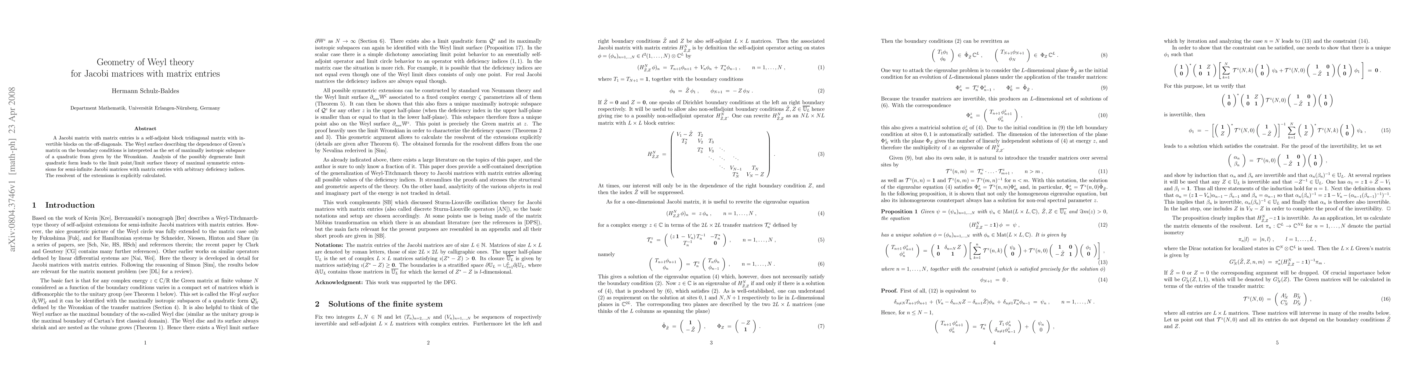 This paper explores the geometry of Weyl theory for Jacobi matrices with matrix entries, interpreting the Weyl surface as a set of maximally isotropic subspaces linked to a quadratic form derived from the Wronskian. It develops a limit point/limit surface theory for semi-infinite Jacobi matrices, calculating the resolvent of the maximal symmetric extensions.