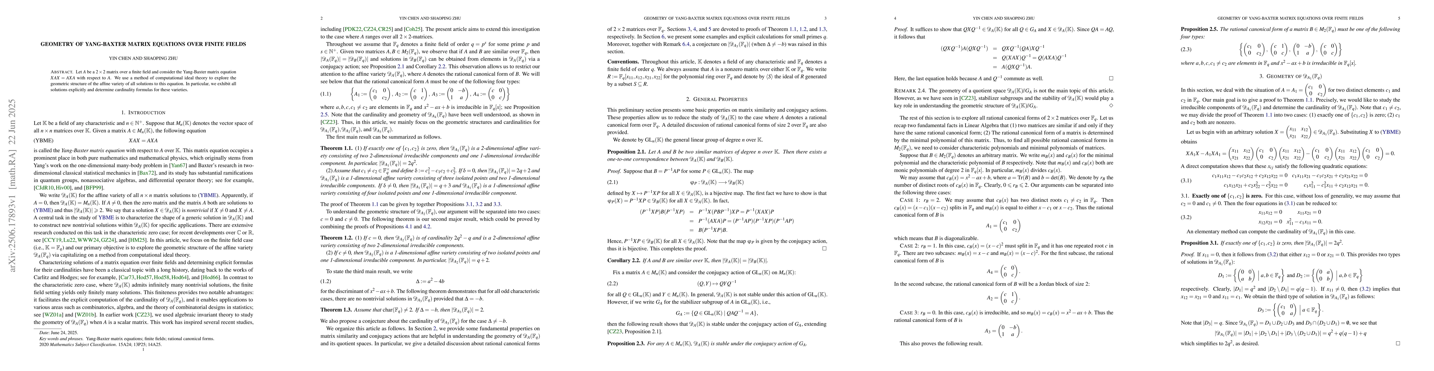 Let $A$ be a $2\times 2$ matrix over a finite field and consider the Yang-Baxter matrix equation $XAX=AXA$ with respect to $A$. We use a method of computational ideal theory to explore the geometric structure of the affine variety of all solutions to this equation. In particular, we exhibit all solutions explicitly and determine cardinality formulas for these varieties.