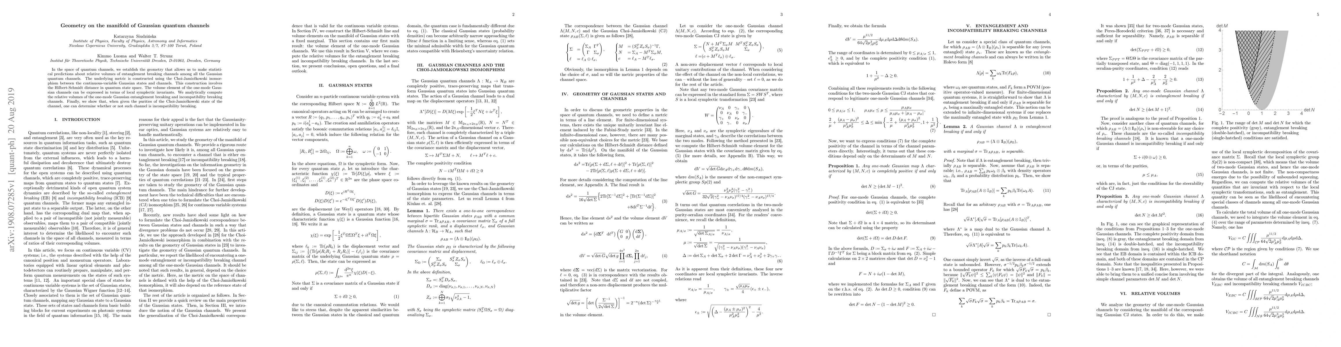 This paper establishes a geometric framework for analyzing Gaussian quantum channels, using the Choi-Jamiołkowski isomorphism to define a metric based on the Hilbert-Schmidt distance. It computes the relative volumes of entanglement breaking channels within this manifold, and determines conditions for incompatibility breaking channels based on the purities of the corresponding Choi-Jamiołkowski states.