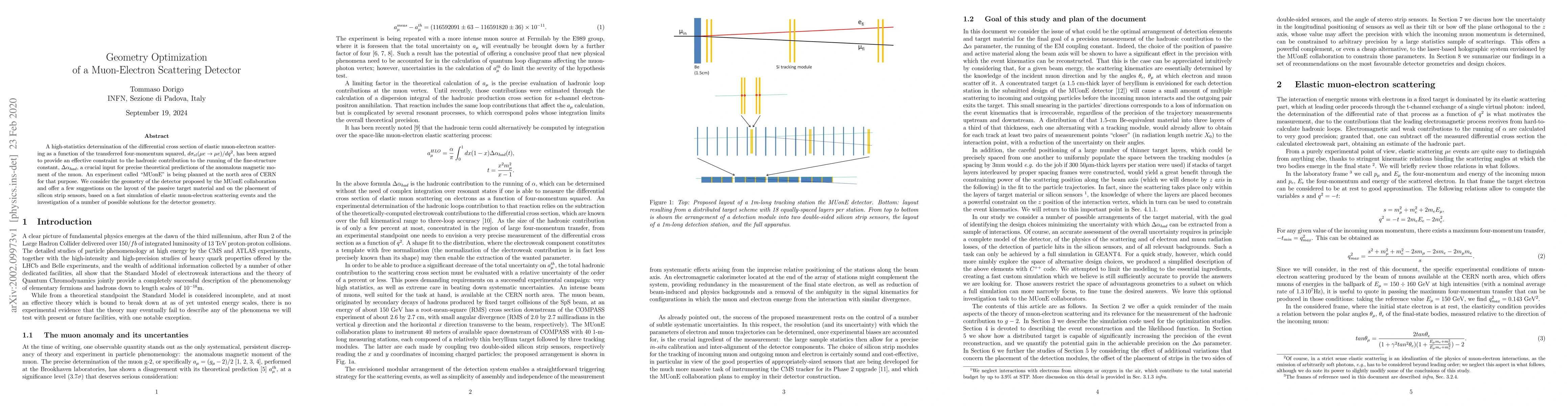This paper discusses the geometry optimization of the MUonE experiment at CERN to measure the differential cross section of muon-electron scattering, aiming to constrain the hadronic contribution to the fine-structure constant. The authors propose improvements to the detector layout, including the arrangement of passive target material and silicon strip sensors, based on simulations of scattering events.