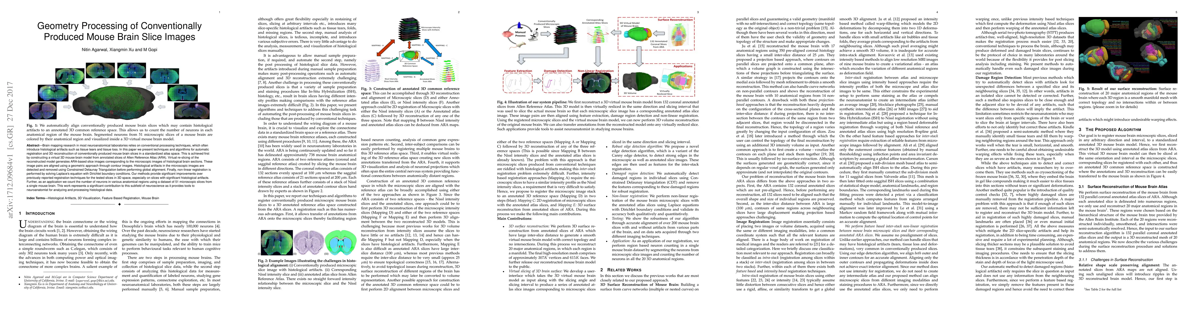 This paper introduces algorithms for automatic registration and 3D reconstruction of conventionally produced mouse brain slices, significantly improving the handling of histological artifacts. It employs geometric methods and non-linear registration to align slice images with the Allen Reference Atlas, enhancing neuron counting in anatomical regions.