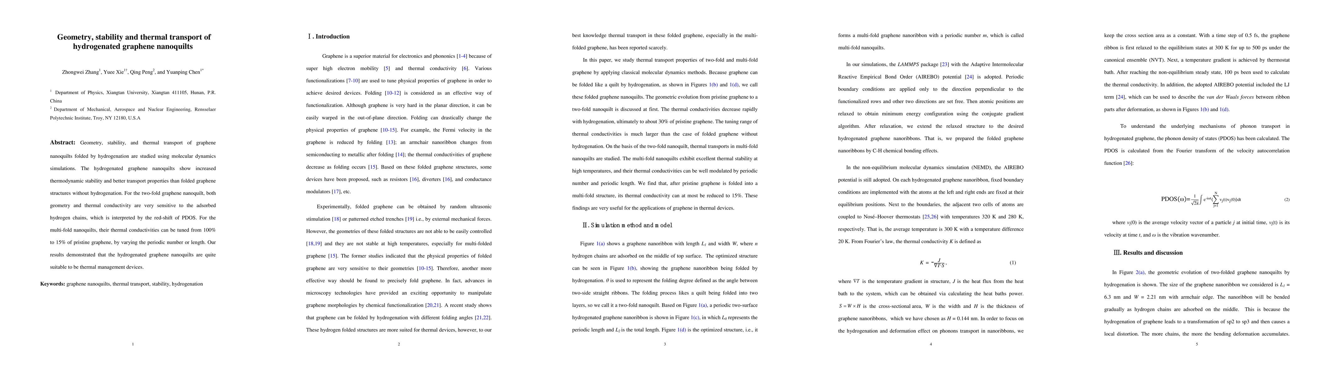 The paper presents a detailed analysis of how hydrogenation affects the stability and thermal transport properties of graphene nanoquilts using molecular dynamics simulations.