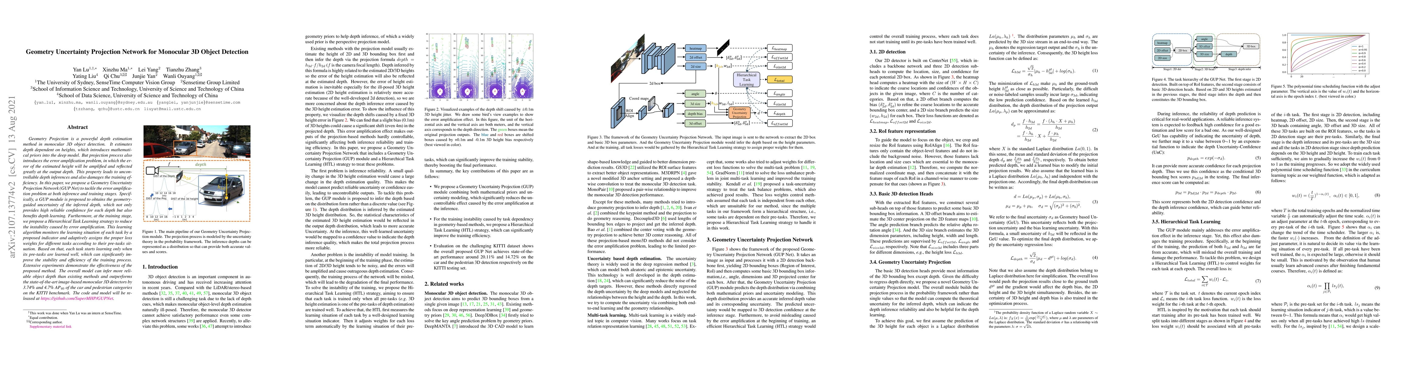 This paper introduces a Geometry Uncertainty Projection Network (GUP Net) to address error amplification in monocular 3D object detection. The GUP module provides geometry-guided uncertainty, enhancing depth inference reliability and training stability through a Hierarchical Task Learning strategy. The proposed method outperforms existing methods by 3.74% and 4.7% in AP40 for cars and pedestrians on the KITTI benchmark.