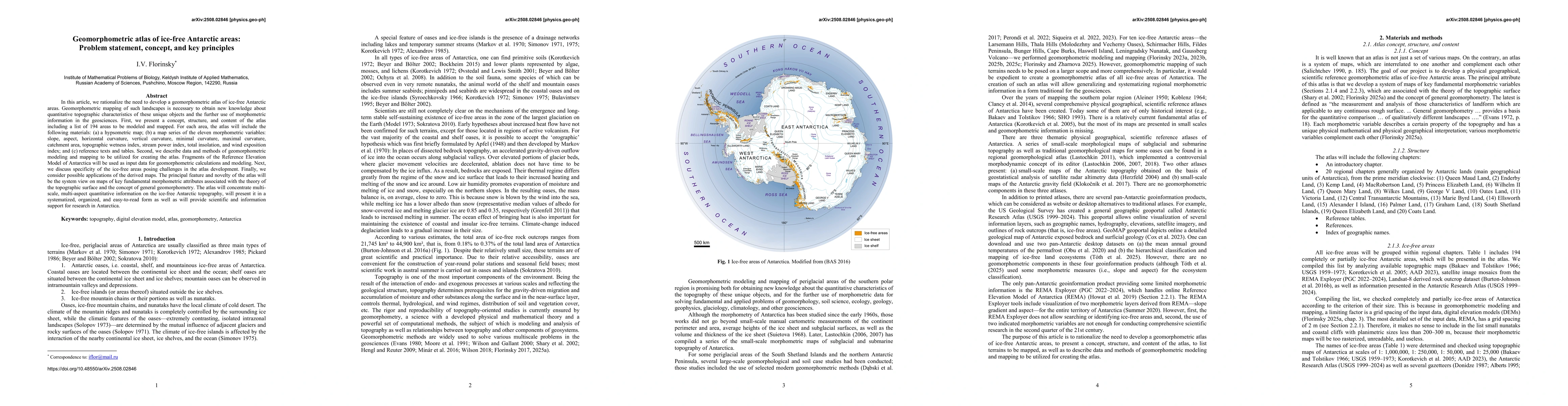 In this article, we rationalize the need to develop a geomorphometric atlas of ice-free Antarctic areas. Geomorphometric mapping of such landscapes is necessary to obtain new knowledge about quantitative topographic characteristics of these unique objects and the further use of morphometric information in the geosciences. First, we present a concept, structure, and content of the atlas including a list of 194 areas to be modeled and mapped. For each area, the atlas will include the following materials: (a) a hypsometric map; (b) a map series of the eleven morphometric variables: slope, aspect, horizontal curvature, vertical curvature, minimal curvature, maximal curvature, catchment area, topographic wetness index, stream power index, total insolation, and wind exposition index; and (c) reference texts and tables. Second, we describe data and methods of geomorphometric modeling and mapping to be utilized for creating the atlas. Fragments of the Reference Elevation Model of Antarctica will be used as input data for geomorphometric calculations and modeling. Next, we discuss specificity of the ice-free areas posing challenges in the atlas development. Finally, we consider possible applications of the derived maps. The principal feature and novelty of the atlas will be the system view on maps of key fundamental morphometric attributes associated with the theory of the topographic surface and the concept of general geomorphometry. The atlas will concentrate multi-scale, multi-aspect quantitative information on the ice-free Antarctic topography, will present it in a systematized, organized, and easy-to-read form as well as will provide scientific and information support for research in Antarctica.