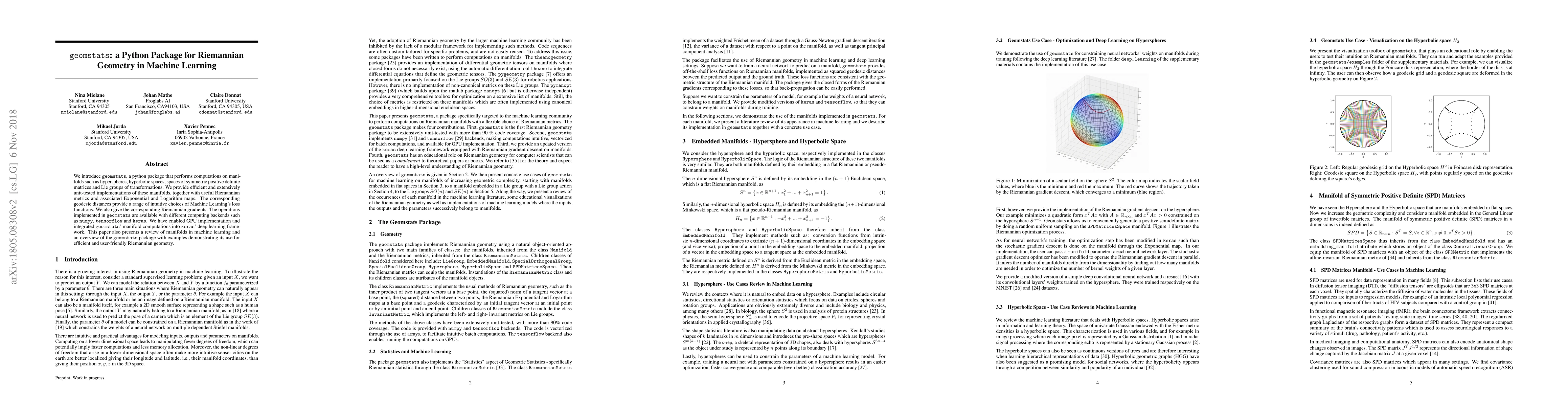 The geomstats package provides efficient Python implementations for computations on various manifolds, including hyperspheres and Lie groups, with GPU support and integration into the keras framework. It offers Riemannian metrics and gradients, facilitating the development of machine learning loss functions.
