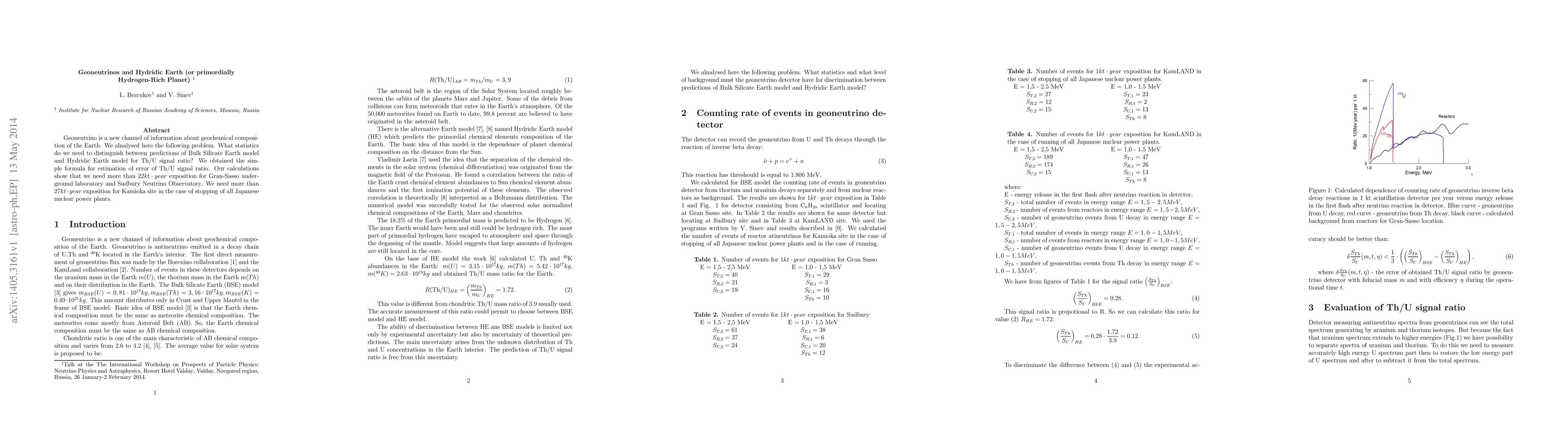 Geoneutrino is a new channel of information about geochemical composition of the Earth. We alnalysed here the following problem. What statistics do we need to distinguish between predictions of Bulk Silicate Earth model and Hydridic Earth model for Th/U signal ratio? We obtained the simple formula for estimation of error of Th/U signal ratio. Our calculations show that we need more than $22 kt \cdot year$ exposition for Gran-Sasso underground laboratory and Sudbury Neutrino Observatory. We need more than $27 kt \cdot year$ exposition for Kamioka site in the case of stopping of all Japanese nuclear power plants.