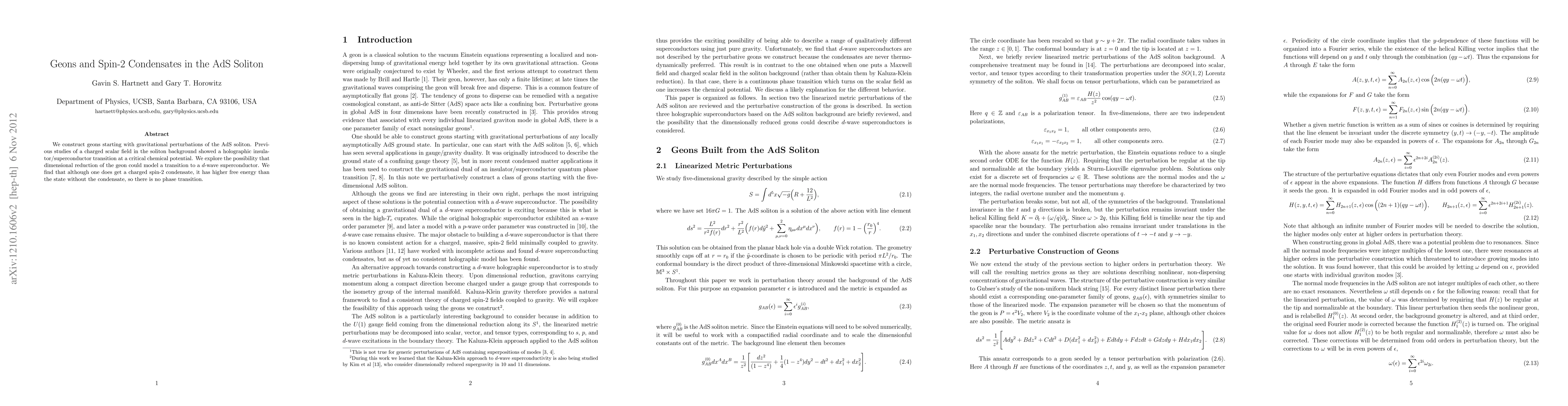 We construct geons starting with gravitational perturbations of the AdS soliton. Previous studies of a charged scalar field in the soliton background showed a holographic insulator/superconductor transition at a critical chemical potential. We explore the possibility that dimensional reduction of the geon could model a transition to a d-wave superconductor. We find that although one does get a charged spin-2 condensate, it has higher free energy than the state without the condensate, so there is no phase transition.