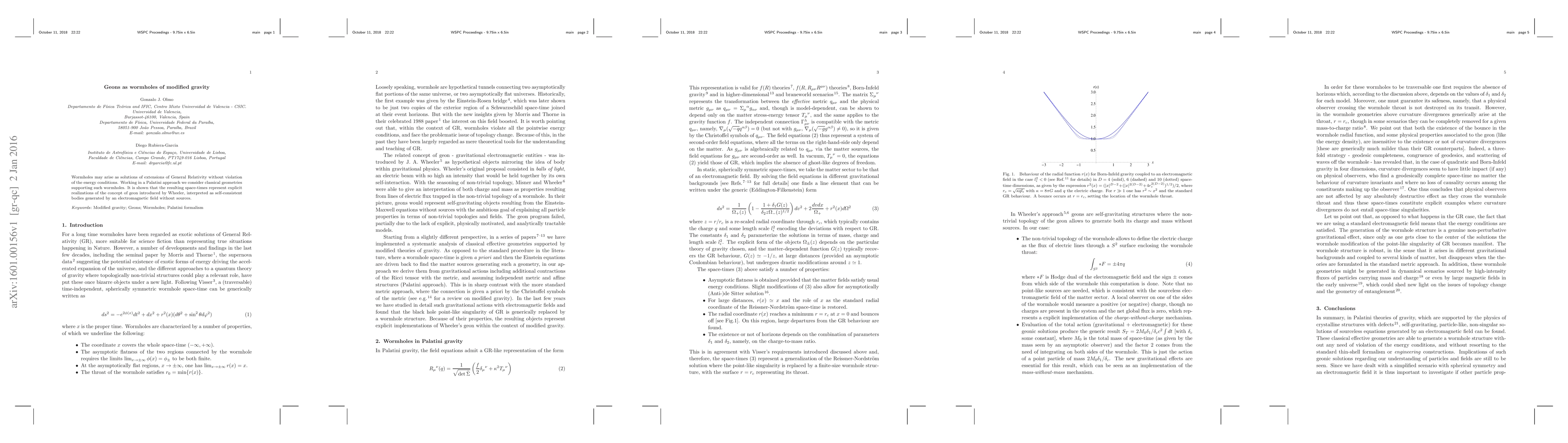 Wormholes may arise as solutions of extensions of General Relativity without violation of the energy conditions. Working in a Palatini approach we consider classical geometries supporting such wormholes. It is shown that the resulting space-times represent explicit realizations of the concept of geon introduced by Wheeler, interpreted as self-consistent bodies generated by an electromagnetic field without sources.