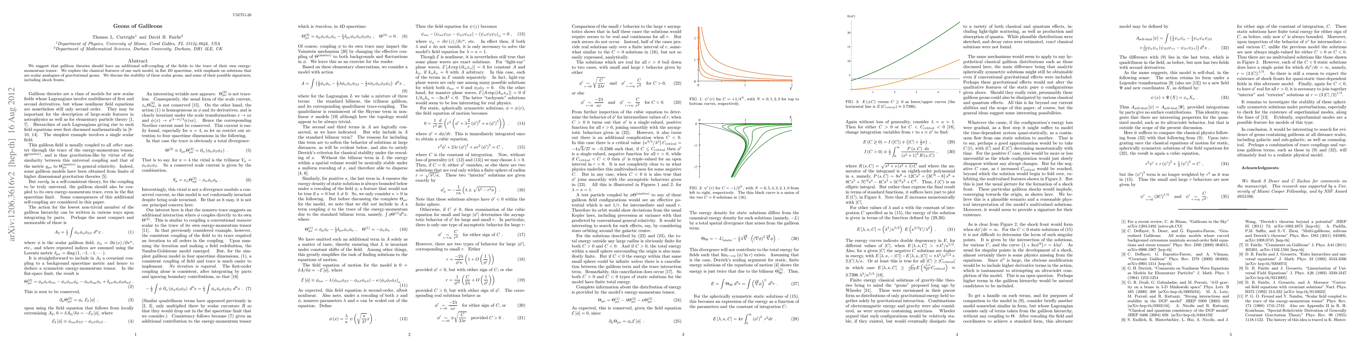 We suggest that galileon theories should have an additional self-coupling of the fields to the trace of their own energy-momentum tensor. We explore the classical features of one such model, in flat 4D spacetime, with emphasis on solutions that are scalar analogues of gravitational geons. We discuss the stability of these scalar geons, and some of their possible signatures, including shock fronts.