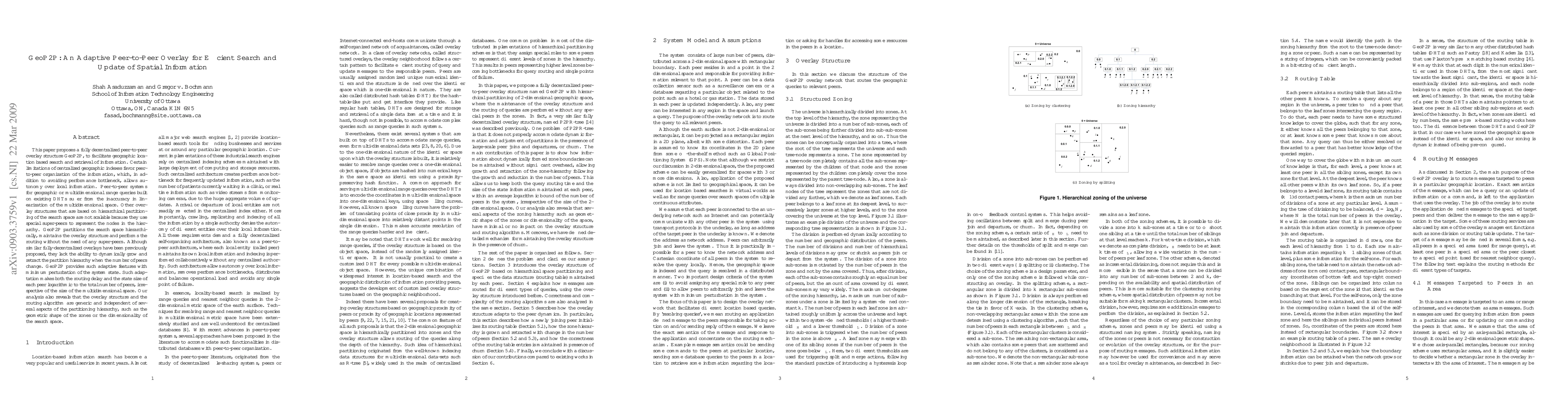 GeoP2P is a decentralized peer-to-peer overlay that efficiently searches and updates spatial information without relying on super-peers or hierarchical partitioning. Its adaptive features ensure low routing delay and system state size, making it suitable for large multidimensional spaces.