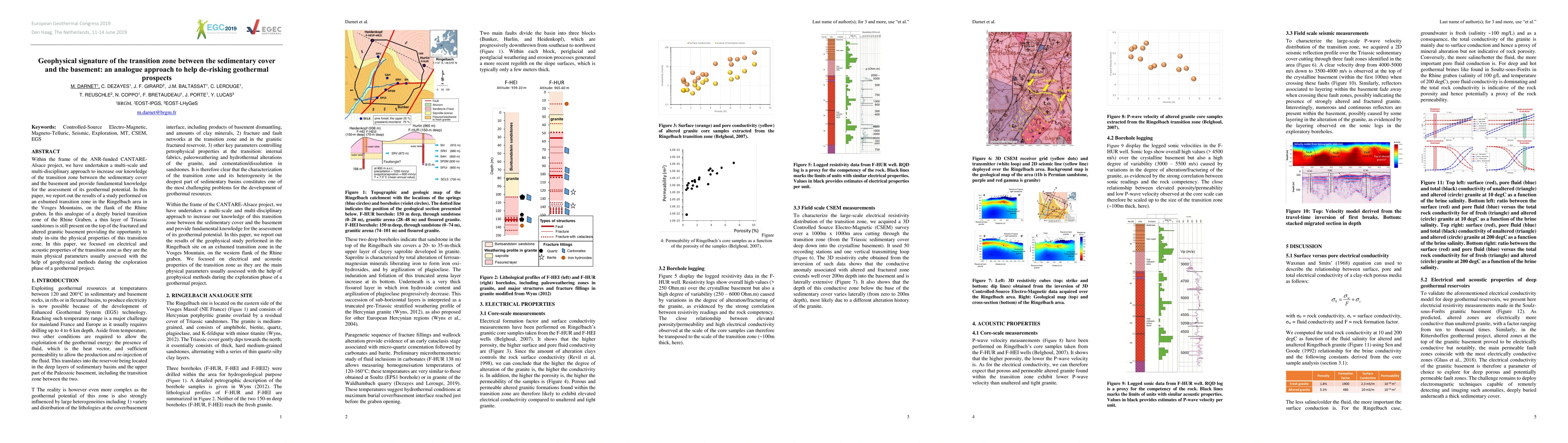 Within the frame of the ANR-funded CANTARE-Alsace project, we have undertaken a multi-scale and multidisciplinary approach to increase our knowledge of the transition zone between the sedimentary cover and the basement and provide fundamental knowledge for the assessment of its geothermal potential. In this paper, we report out the results of a study performed on an exhumed transition zone in the Ringelbach area in the Vosges Mountains, on the flank of the Rhine graben. In this analogue of a deeply buried transition zone of the Rhine Graben, a thin layer of Triassic sandstones is still present on the top of the fractured and altered granitic basement providing the opportunity to study in-situ the physical properties of this transition zone. In this paper, we focused on electrical and acoustic properties of the transition zone as they are the main physical parameters usually assessed with the help of geophysical methods during the exploration phase of a geothermal project.
