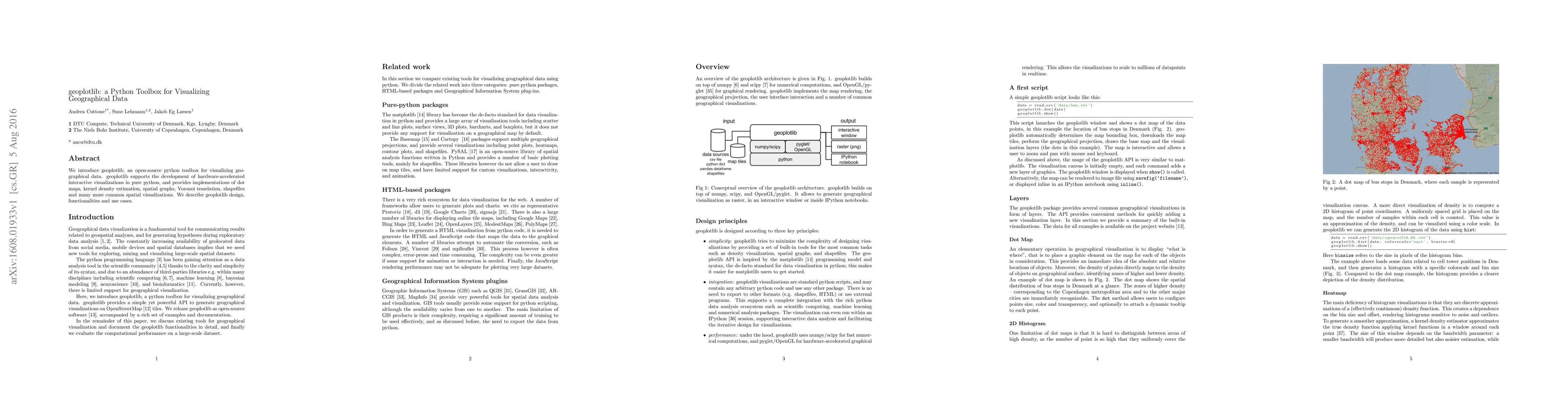 Geoplotlib is an open-source Python toolbox for creating interactive geographical visualizations, offering features like dot maps, kernel density estimation, and Voronoi tesselation, all in pure Python. It supports hardware-accelerated visualizations and includes various spatial data visualization techniques.