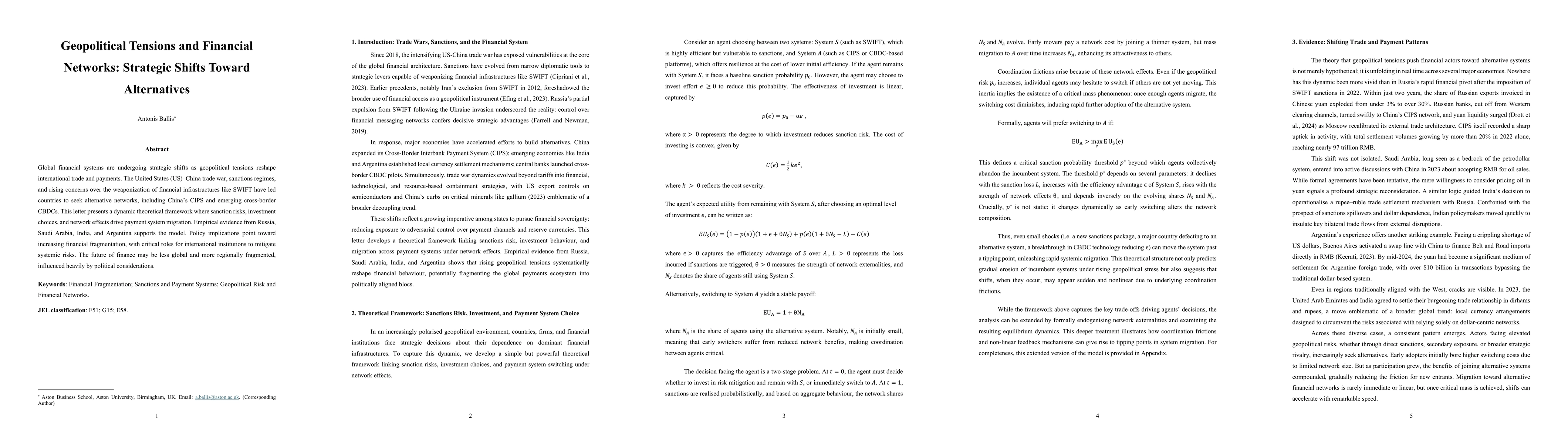 Global financial systems are undergoing strategic shifts as geopolitical tensions reshape international trade and payments. The United States (US)-China trade war, sanctions regimes, and rising concerns over the weaponization of financial infrastructures like SWIFT have led countries to seek alternative networks, including China's CIPS and emerging cross-border CBDCs. This letter presents a dynamic theoretical framework where sanction risks, investment choices, and network effects drive payment system migration. Empirical evidence from Russia, Saudi Arabia, India, and Argentina supports the model. Policy implications point toward increasing financial fragmentation, with critical roles for international institutions to mitigate systemic risks. The future of finance may be less global and more regionally fragmented, influenced heavily by political considerations.