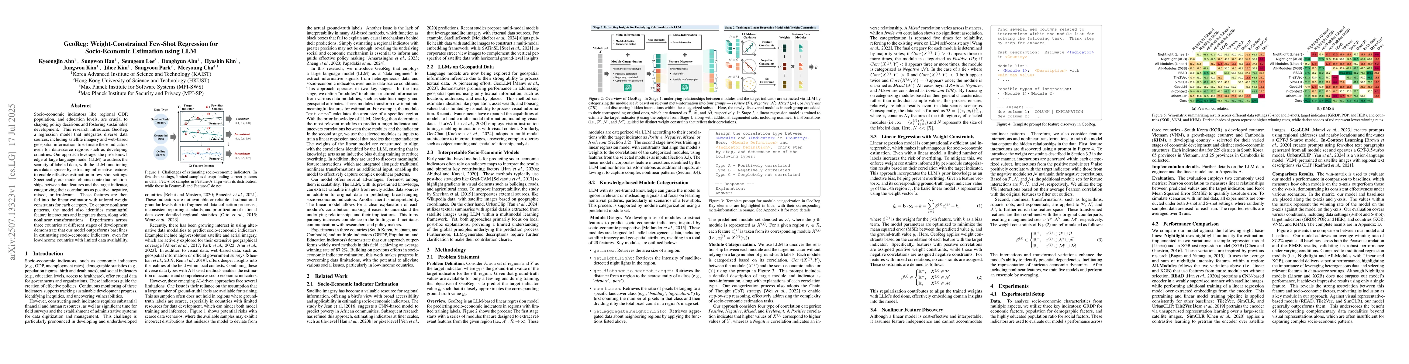 GeoReg introduces a weight-constrained few-shot regression framework that effectively combines LLM-driven feature extraction with a linear estimator, tailored for socio-economic estimation in data-scarce regions.