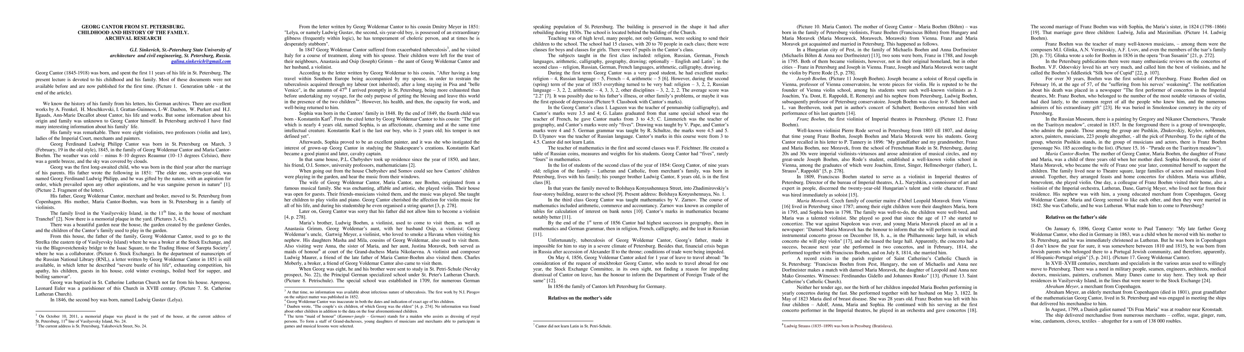 Georg Cantor (1845-1918) was born, and spent the first 11 years of his life in St. Petersburg. The present lecture is devoted to his childhood and his family. Most of these documents were not available before and are now published for the first time.