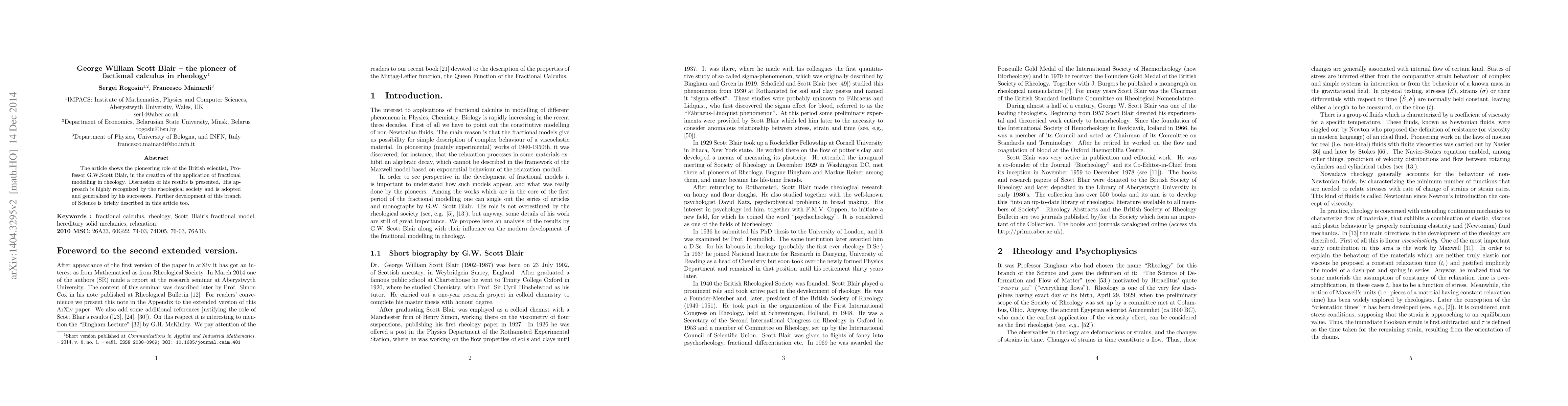 The article shows the pioneering role of the British scientist, Professor G.W.Scott Blair, in the creation of the application of fractional modelling in rheology. Discussion of his results is presented. His approach is highly recognized by the rheological society and is adopted and generalized by his successors. Further development of this branch of Science is briefly described in this article too.