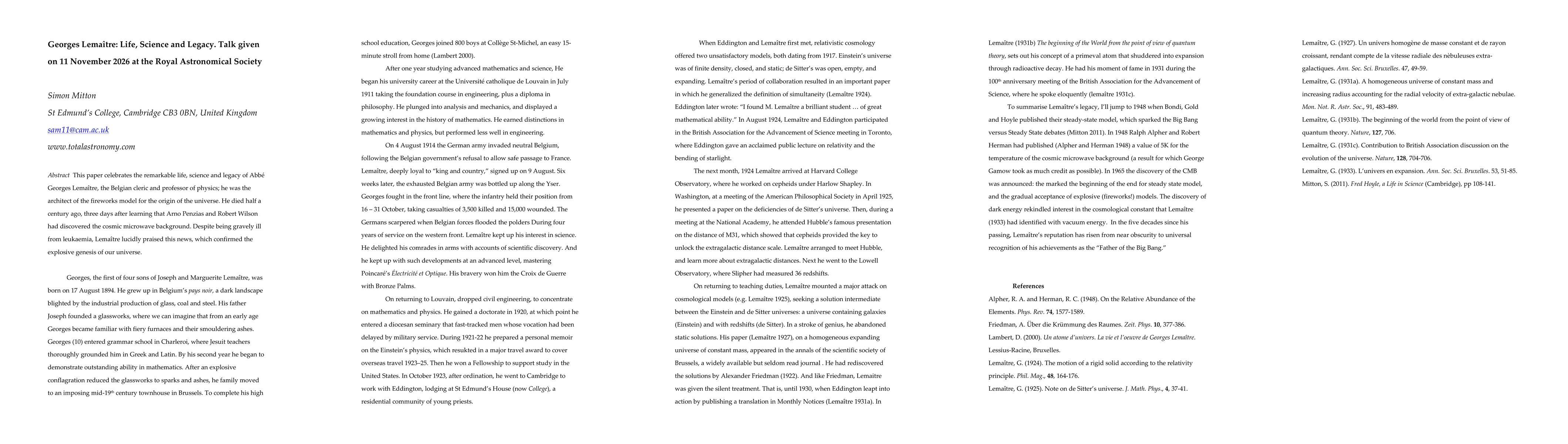 This paper honors the life and scientific contributions of Georges Lemaître, the Belgian cleric and physicist who proposed the Big Bang theory, and reflects on his profound legacy in cosmology. Lemaître's validation upon learning of the cosmic microwave background discovery underscores his enduring impact on our understanding of the universe's origin.