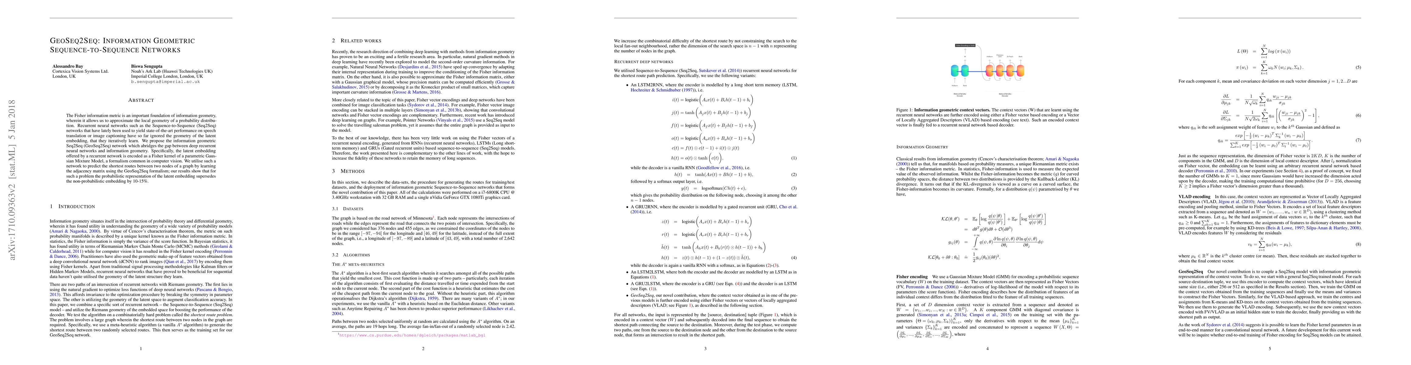 The Fisher information metric is an important foundation of information geometry, wherein it allows us to approximate the local geometry of a probability distribution. Recurrent neural networks such as the Sequence-to-Sequence (Seq2Seq) networks that have lately been used to yield state-of-the-art performance on speech translation or image captioning have so far ignored the geometry of the latent embedding, that they iteratively learn. We propose the information geometric Seq2Seq (GeoSeq2Seq) network which abridges the gap between deep recurrent neural networks and information geometry. Specifically, the latent embedding offered by a recurrent network is encoded as a Fisher kernel of a parametric Gaussian Mixture Model, a formalism common in computer vision. We utilise such a network to predict the shortest routes between two nodes of a graph by learning the adjacency matrix using the GeoSeq2Seq formalism; our results show that for such a problem the probabilistic representation of the latent embedding supersedes the non-probabilistic embedding by 10-15\%.