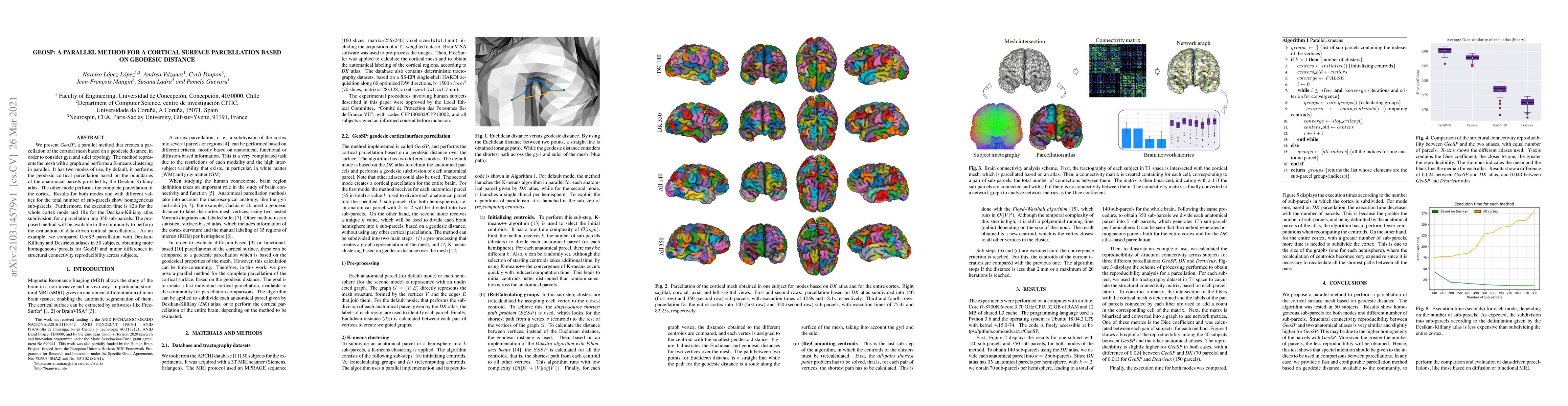 GeoSP is a parallel method for cortical surface parcellation based on geodesic distance, employing K-means clustering to create homogeneous sub-parcels. It offers two modes: one using the Desikan-Killiany atlas and another for a complete cortical parcellation, with execution times of 82 s and 18 s respectively for 350 sub-parcels.