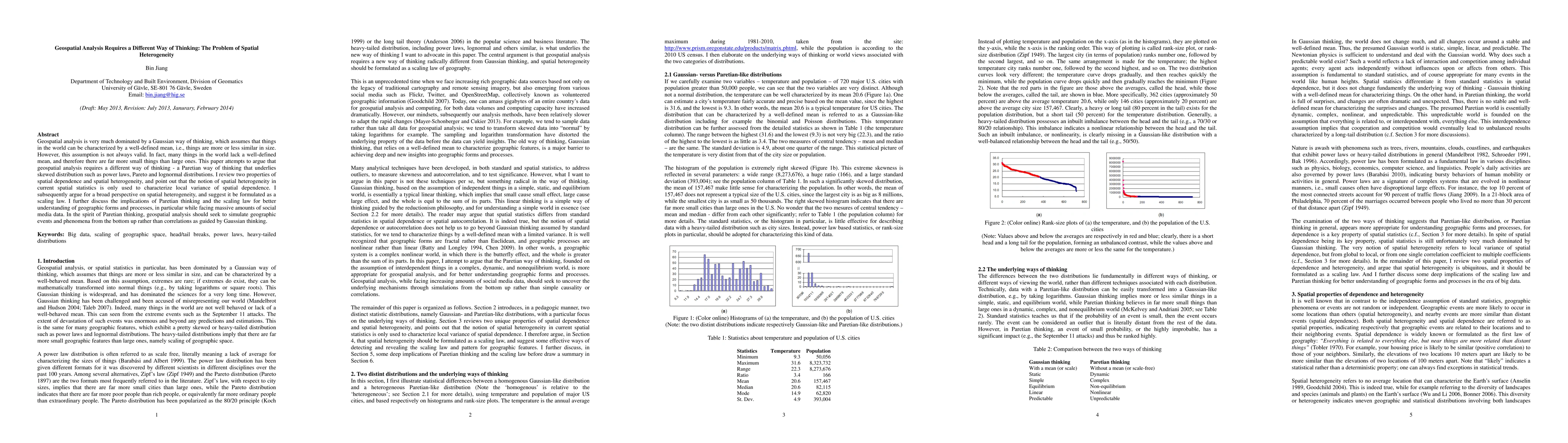 Geospatial analysis is very much dominated by a Gaussian way of thinking, which assumes that things in the world can be characterized by a well-defined mean, i.e., things are more or less similar in size. However, this assumption is not always valid. In fact, many things in the world lack a well-defined mean, and therefore there are far more small things than large ones. This paper attempts to argue that geospatial analysis requires a different way of thinking - a Paretian way of thinking that underlies skewed distribution such as power laws, Pareto and lognormal distributions. I review two properties of spatial dependence and spatial heterogeneity, and point out that the notion of spatial heterogeneity in current spatial statistics is only used to characterize local variance of spatial dependence. I subsequently argue for a broad perspective on spatial heterogeneity, and suggest it be formulated as a scaling law. I further discuss the implications of Paretian thinking and the scaling law for better understanding of geographic forms and processes, in particular while facing massive amounts of social media data. In the spirit of Paretian thinking, geospatial analysis should seek to simulate geographic events and phenomena from the bottom up rather than correlations as guided by Gaussian thinking.