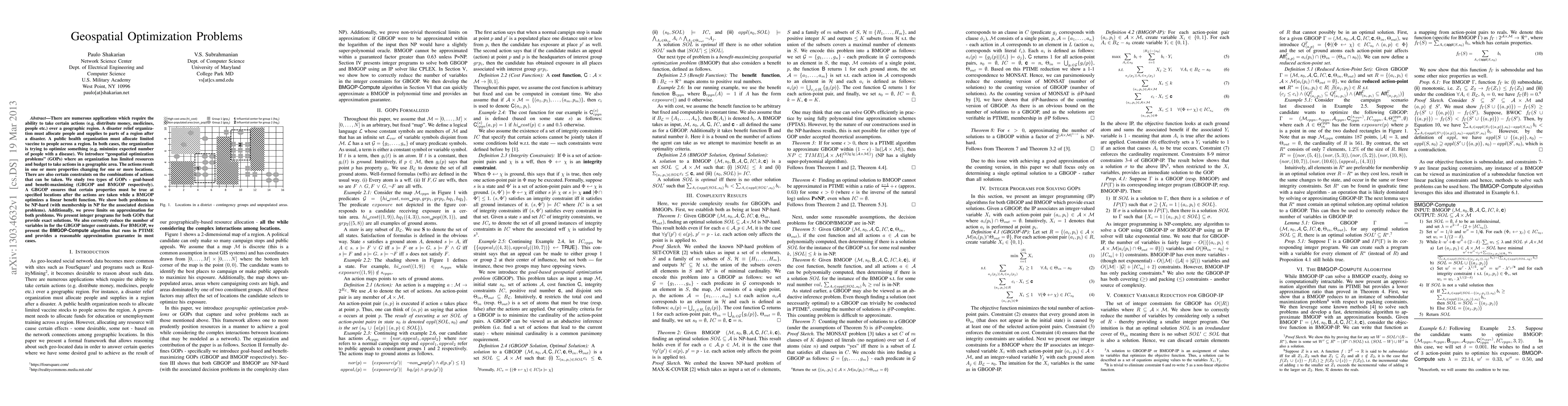 There are numerous applications which require the ability to take certain actions (e.g. distribute money, medicines, people etc.) over a geographic region. A disaster relief organization must allocate people and supplies to parts of a region after a disaster. A public health organization must allocate limited vaccine to people across a region. In both cases, the organization is trying to optimize something (e.g. minimize expected number of people with a disease). We introduce "geospatial optimization problems" (GOPs) where an organization has limited resources and budget to take actions in a geographic area. The actions result in one or more properties changing for one or more locations. There are also certain constraints on the combinations of actions that can be taken. We study two types of GOPs - goal-based and benefit-maximizing (GBGOP and BMGOP respectively). A GBGOP ensures that certain properties must be true at specified locations after the actions are taken while a BMGOP optimizes a linear benefit function. We show both problems to be NP-hard (with membership in NP for the associated decision problems). Additionally, we prove limits on approximation for both problems. We present integer programs for both GOPs that provide exact solutions. We also correctly reduce the number of variables in for the GBGOP integer constraints. For BMGOP, we present the BMGOP-Compute algorithm that runs in PTIME and provides a reasonable approximation guarantee in most cases.