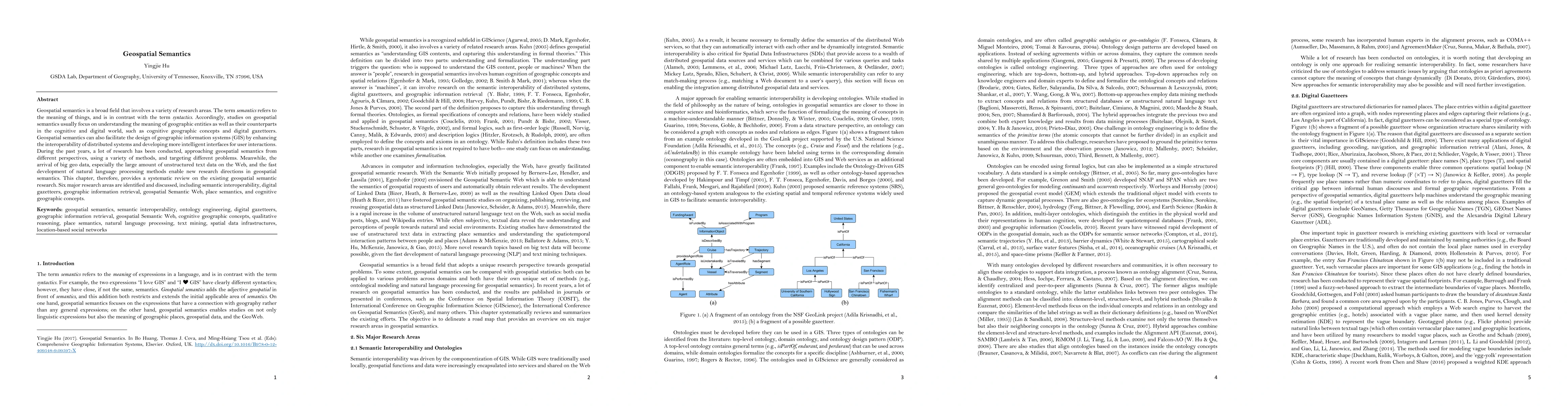 This paper reviews geospatial semantics, focusing on understanding geographic entities' meanings and their cognitive and digital counterparts. It highlights six major research areas: semantic interoperability, digital gazetteers, geographic information retrieval, geospatial Semantic Web, place semantics, and cognitive geographic concepts.