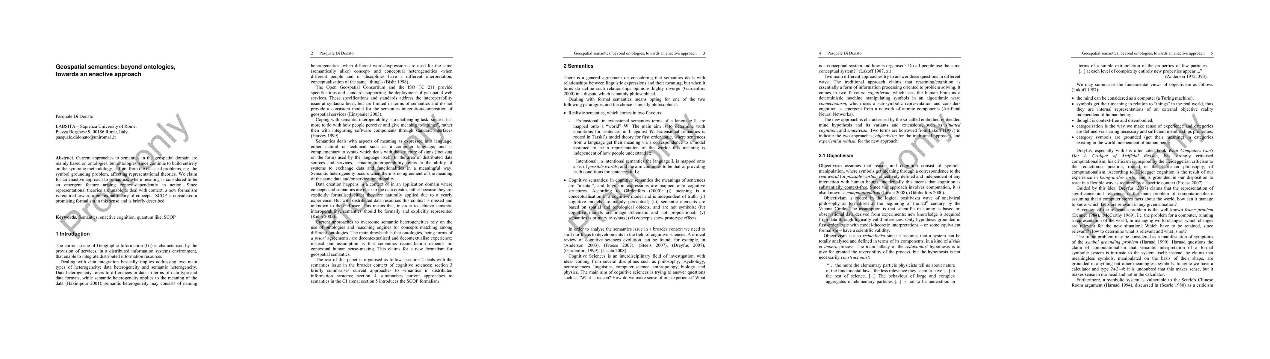 This paper critiques the limitations of ontology-based semantics in geospatial contexts due to the symbol grounding problem and advocates for an enactive approach where meaning emerges contextually through action. It proposes SCOP as a promising formalism for a contextual theory of concepts.