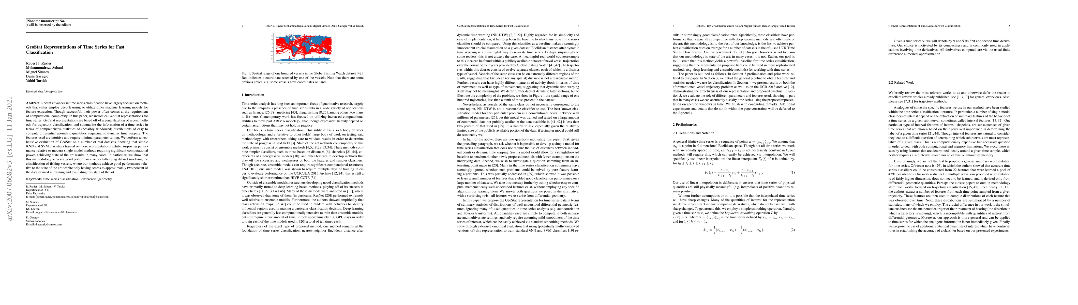 This paper presents GeoStat representations for time series classification, which summarize data using intuitive, easily computed differential geometric statistics. These representations enable simple classifiers like KNN and SVM to achieve state-of-the-art performance with minimal computational complexity compared to modern deep learning methods.