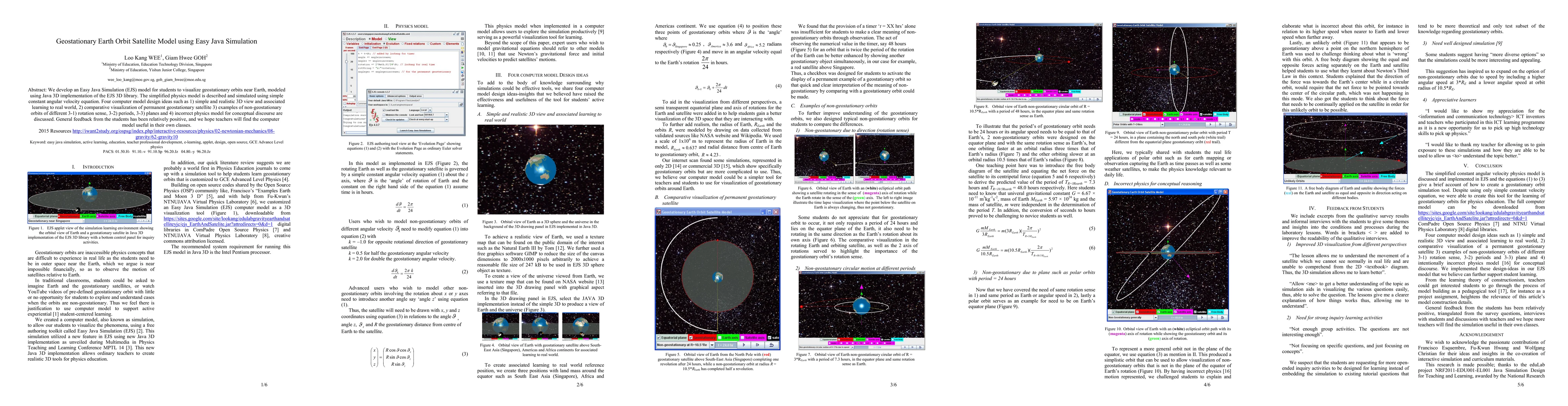 This research paper presents an Easy Java Simulation (EJS) model to visualize geostationary orbits using Java 3D, focusing on a simplified physics model. It includes comparative visualizations and non-geostationary examples, receiving positive student feedback. The authors aim to provide teachers with a useful tool for teaching Newtonian mechanics and gravity.