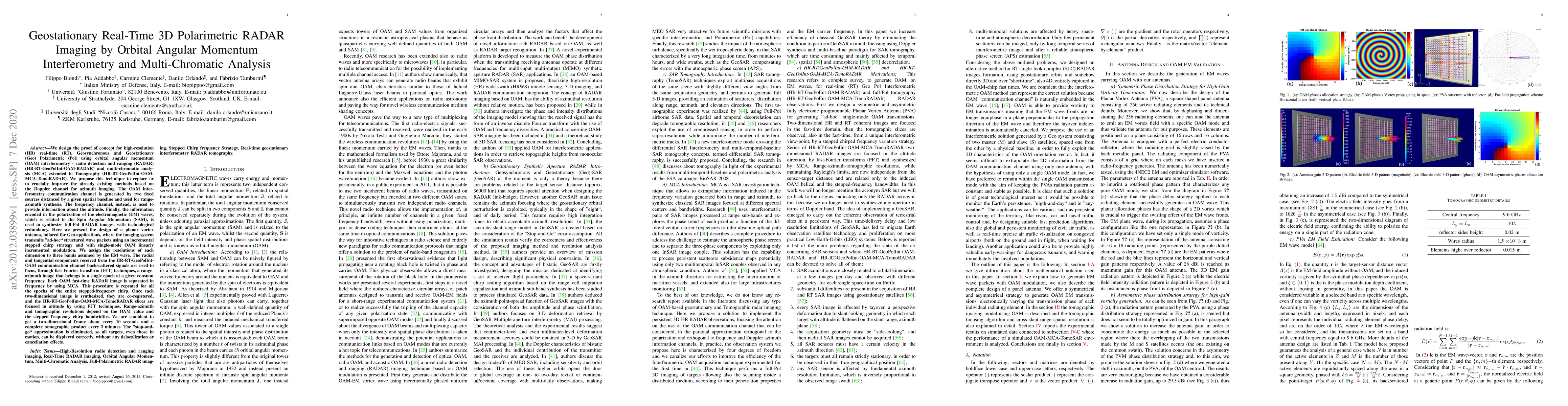 We design the proof of concept for high-resolution (HR) real-time (RT), Geosynchronous and Geostationary (Geo) Polarimetric (Pol) using orbital angular momentum (OAM) interferometry - radio detection and ranging (RADAR) (HR-RT-GeoPolInt-OAM-RADAR) and multi-chromatic analysis (MCA) extended to Tomography (HR-RT-GeoPolInt-OAM-MCA-TomoRADAR). The OAM interferometry communication channel is generated by two fixed sources distanced by a given spatial baseline and used for range-azimuth synthesis. The frequency channel, instead, is used to provide information about the altitude. Finally, the information encoded in the polarization of the electromagnetic (EM) waves, which is related to the Spin Angular Momentum (SAM), is used to synthesize full-Pol RADAR images, with technological redundancy. Here we present the design of a planar vortex antenna, tailored for Geo applications, where the imaging system transmits ''ad-hoc`` structured wave packets using an incremental stepped chirp strategy and with single-mode OAM linearly incremented modulation. We assign the resolutions of each dimension to three bands assumed by the EM wave. The radial and tangential components received from the HR-RT-GeoPolInt-OAM communication channel backscattered signals are used to focus, through fast-Fourier transform (FFT) techniques, a range-azimuth image that belongs to a single epoch at a given constant frequency. Each OAM fast-time RADAR image is separated in frequency by using MCA. This procedure is repeated for all the epochs of the entire stepped-frequency chirp. Once each two-dimensional image is synthesized, they are co-registered, and the HR-RT-GeoPolInt-OAM-MCA-TomoRADAR slices are focused in altitude by using FFT techniques. Range-azimuth and tomographic resolutions depend on the OAM value and the stepped frequency chirp bandwidths.
