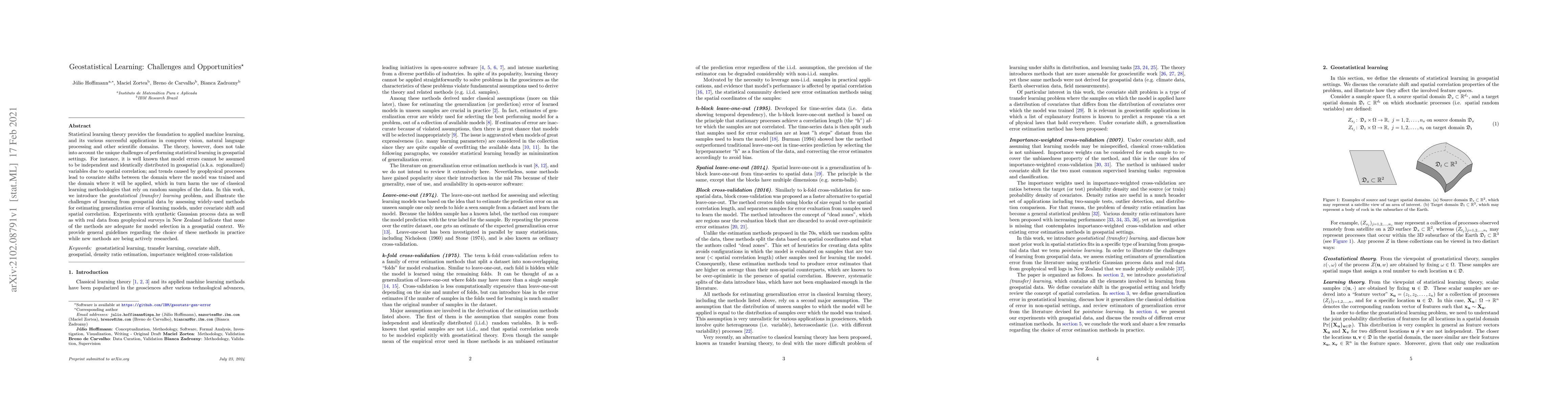 Statistical learning theory provides the foundation to applied machine learning, and its various successful applications in computer vision, natural language processing and other scientific domains. The theory, however, does not take into account the unique challenges of performing statistical learning in geospatial settings. For instance, it is well known that model errors cannot be assumed to be independent and identically distributed in geospatial (a.k.a. regionalized) variables due to spatial correlation; and trends caused by geophysical processes lead to covariate shifts between the domain where the model was trained and the domain where it will be applied, which in turn harm the use of classical learning methodologies that rely on random samples of the data. In this work, we introduce the geostatistical (transfer) learning problem, and illustrate the challenges of learning from geospatial data by assessing widely-used methods for estimating generalization error of learning models, under covariate shift and spatial correlation. Experiments with synthetic Gaussian process data as well as with real data from geophysical surveys in New Zealand indicate that none of the methods are adequate for model selection in a geospatial context. We provide general guidelines regarding the choice of these methods in practice while new methods are being actively researched.