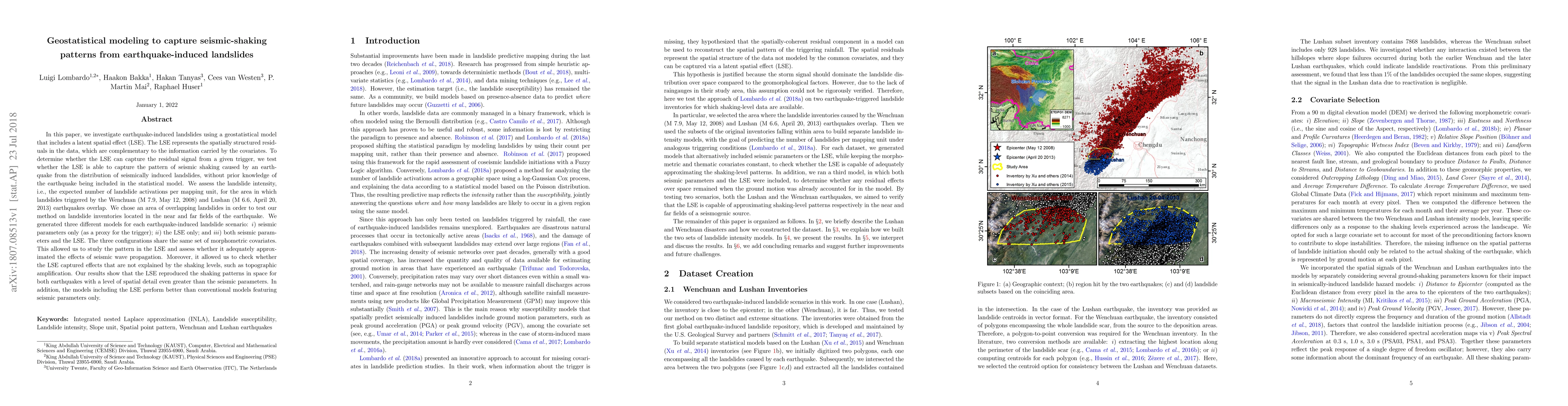 This paper develops a geostatistical model with a latent spatial effect (LSE) to capture seismic-shaking patterns from earthquake-induced landslides, demonstrating that the LSE can reproduce seismic shaking patterns more accurately than seismic parameters alone. The study focuses on landslides from the Wenchuan and Lushan earthquakes, showing that the LSE captures additional effects like topographic amplification.