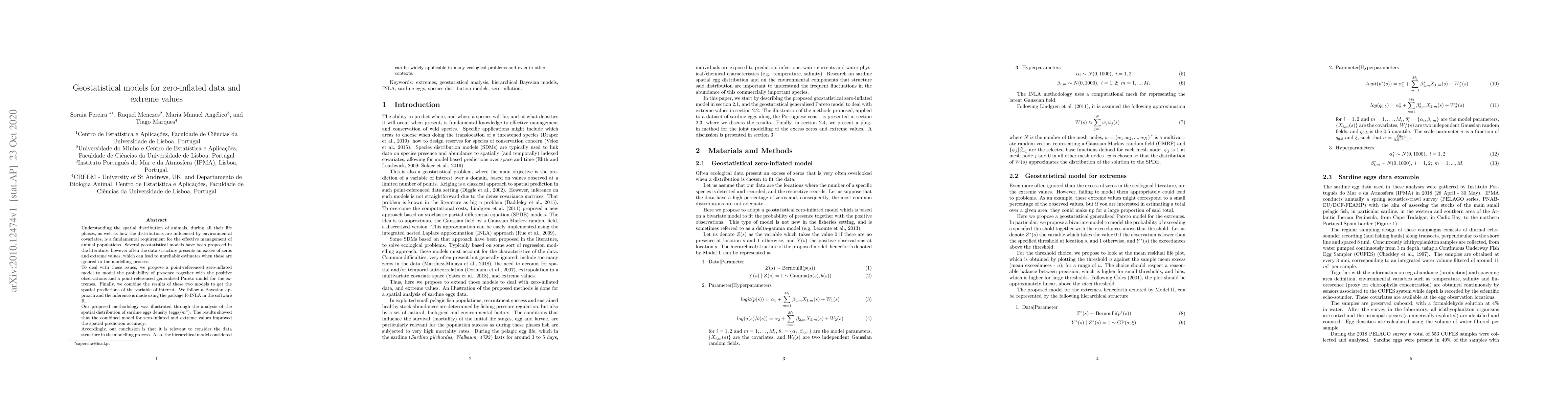 Understanding the spatial distribution of animals, during all their life phases, as well as how the distributions are influenced by environmental covariates, is a fundamental requirement for the effective management of animal populations. Several geostatistical models have been proposed in the literature, however often the data structure presents an excess of zeros and extreme values, which can lead to unreliable estimates when these are ignored in the modelling process. To deal with these issues, we propose a point-referenced zero-inflated model to model the probability of presence together with the positive observations and a point-referenced generalised Pareto model for the extremes. Finally, we combine the results of these two models to get the spatial predictions of the variable of interest. We follow a Bayesian approach and the inference is made using the package R-INLA in the software R. Our proposed methodology was illustrated through the analysis of the spatial distribution of sardine eggs density (eggs/$m^3$). The results showed that the combined model for zero-inflated and extreme values improved the spatial prediction accuracy. Accordingly, our conclusion is that it is relevant to consider the data structure in the modelling process. Also, the hierarchical model considered can be widely applicable in many ecological problems and even in other contexts.