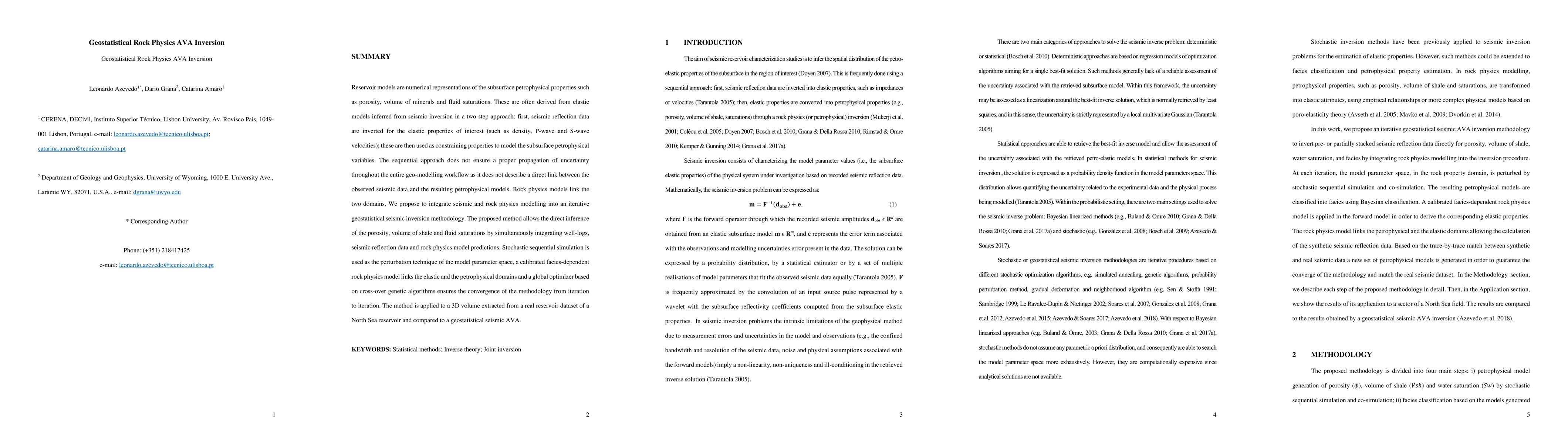 This paper proposes an iterative geostatistical seismic inversion methodology to directly infer subsurface petrophysical properties by integrating seismic reflection data, well-logs, and rock physics models. The method uses stochastic sequential simulation and a global optimizer to ensure convergence, demonstrating its application on a North Sea reservoir dataset.