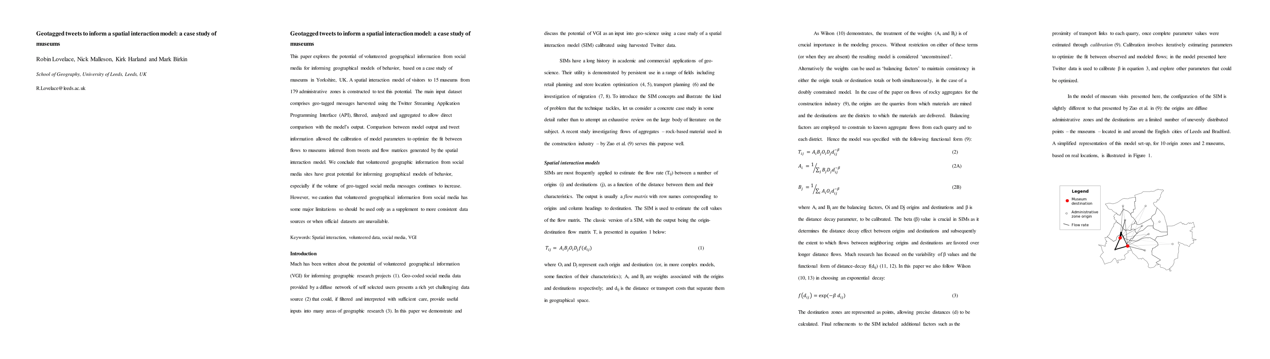This paper explores the potential of volunteered geographical information from social media for informing geographical models of behavior, based on a case study of museums in Yorkshire, UK. A spatial interaction model of visitors to 15 museums from 179 administrative zones is constructed to test this potential. The main input dataset comprises geo-tagged messages harvested using the Twitter Streaming Application Programming Interface (API), filtered, analyzed and aggregated to allow direct comparison with the model's output. Comparison between model output and tweet information allowed the calibration of model parameters to optimize the fit between flows to museums inferred from tweets and flow matrices generated by the spatial interaction model. We conclude that volunteered geographic information from social media sites have great potential for informing geographical models of behavior, especially if the volume of geo-tagged social media messages continues to increase. However, we caution that volunteered geographical information from social media has some major limitations so should be used only as a supplement to more consistent data sources or when official datasets are unavailable.