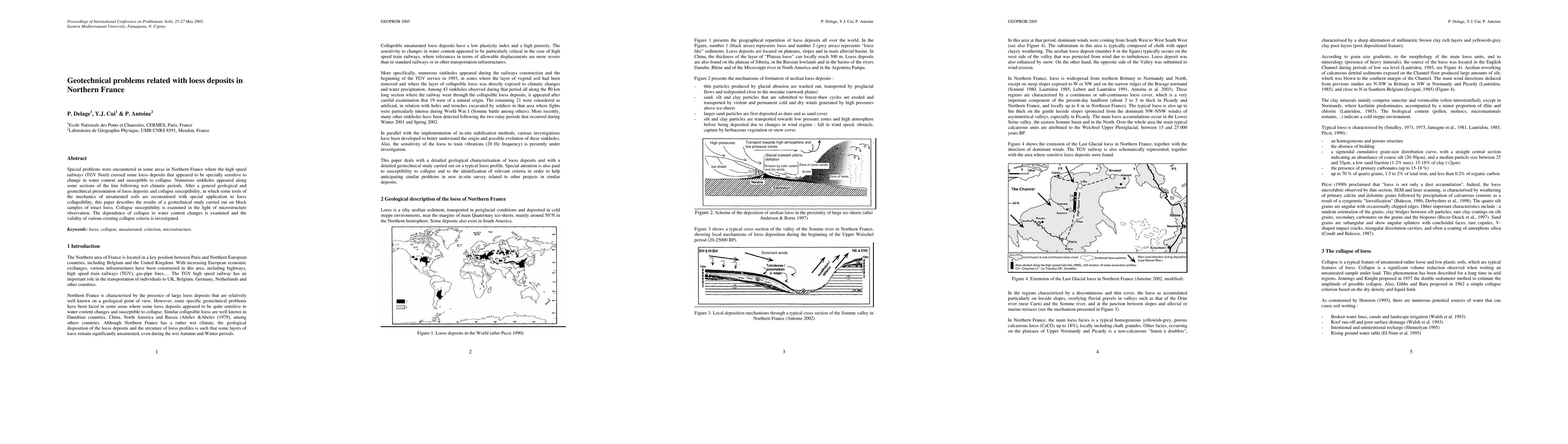 Special problems were encountered in some areas in Northern France where the high speed railways (TGV Nord) crossed some loess deposits that appeared to be specially sensitive to change in water content and susceptible to collapse. Numerous sinkholes appeared along some sections of the line following wet climatic periods. After a general geological and geotechnical presentation of loess deposits and collapse susceptibility, in which some tools of the mechanics of unsaturated soils are reconsidered with special application to loess collapsibility, this paper describes the results of a geotechnical study carried out on block samples of intact loess. Collapse susceptibility is examined in the light of microstructure observation. The dependence of collapse to water content changes is examined and the validity of various existing collapse criteria is investigated.
