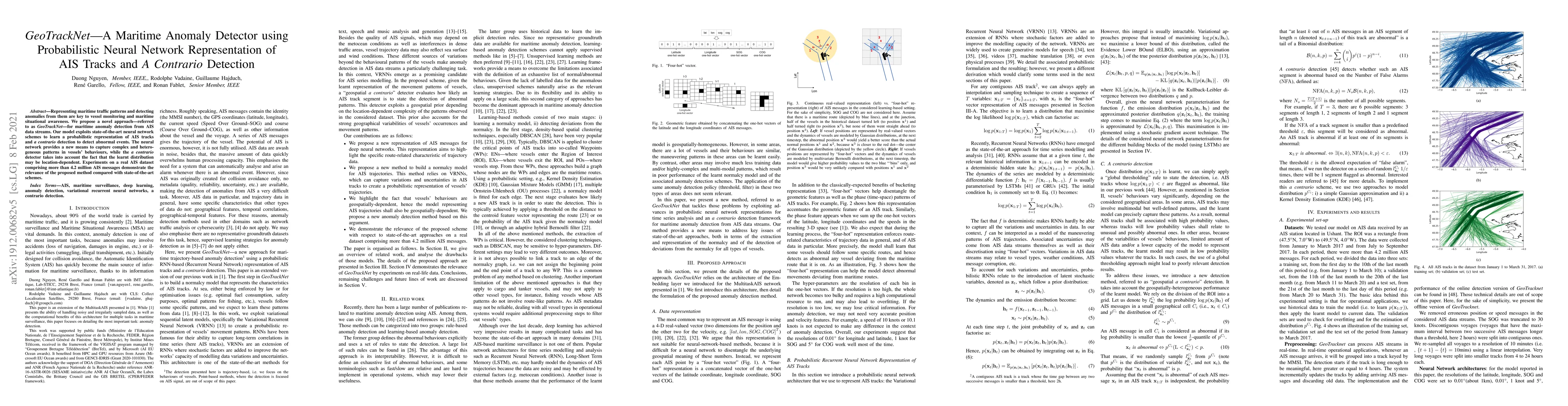 GeoTrackNet leverages a probabilistic neural network to represent and detect anomalies in maritime traffic patterns from AIS data streams using a contrario detection. Experiments show its effectiveness in identifying abnormal vessel behaviors compared to existing methods.