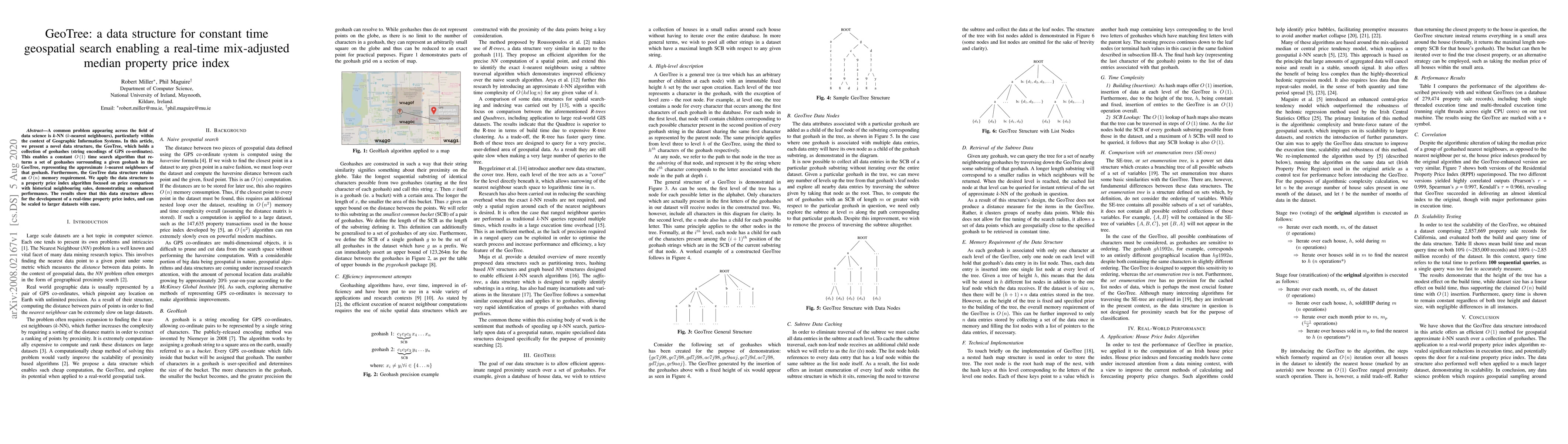 A common problem appearing across the field of data science is $k$-NN ($k$-nearest neighbours), particularly within the context of Geographic Information Systems. In this article, we present a novel data structure, the GeoTree, which holds a collection of geohashes (string encodings of GPS co-ordinates). This enables a constant $O\left(1\right)$ time search algorithm that returns a set of geohashes surrounding a given geohash in the GeoTree, representing the approximate $k$-nearest neighbours of that geohash. Furthermore, the GeoTree data structure retains $O\left(n\right)$ memory requirement. We apply the data structure to a property price index algorithm focused on price comparison with historical neighbouring sales, demonstrating an enhanced performance. The results show that this data structure allows for the development of a real-time property price index, and can be scaled to larger datasets with ease.
