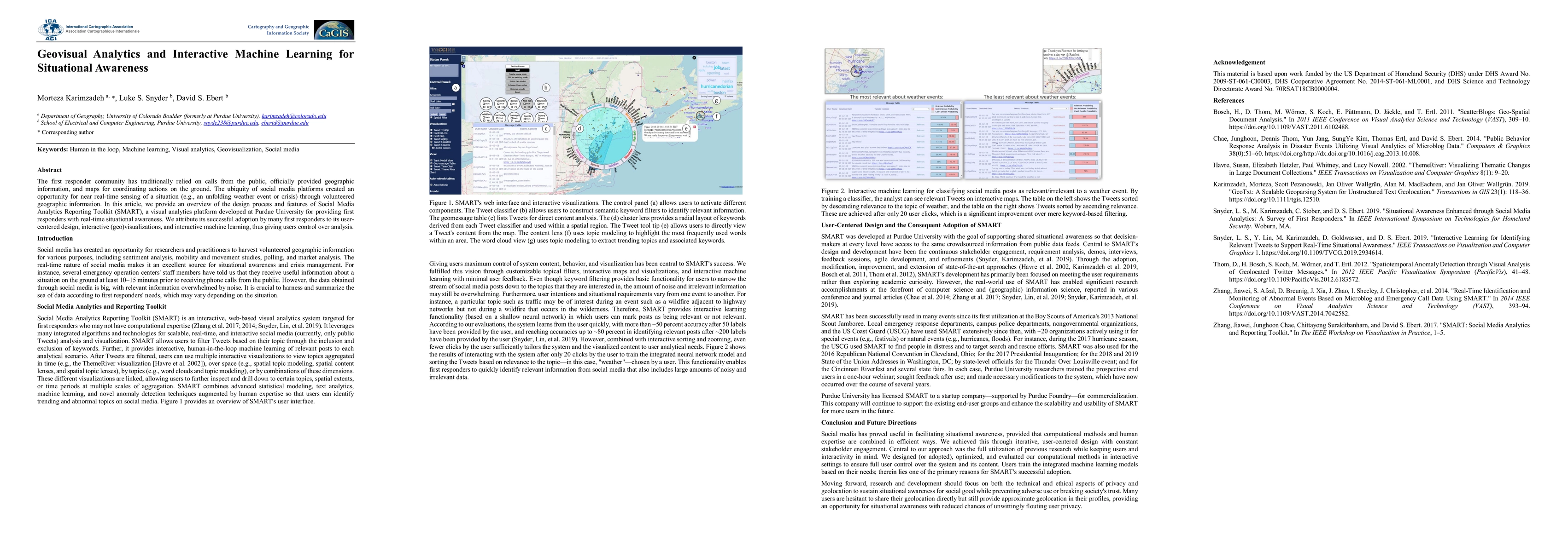 This paper discusses the development of the Social Media Analytics Reporting Toolkit (SMART), a visual analytics platform designed to enhance first responders' situational awareness through real-time data from social media. The platform's success is attributed to its user-centered design, interactive visualizations, and interactive machine learning capabilities.