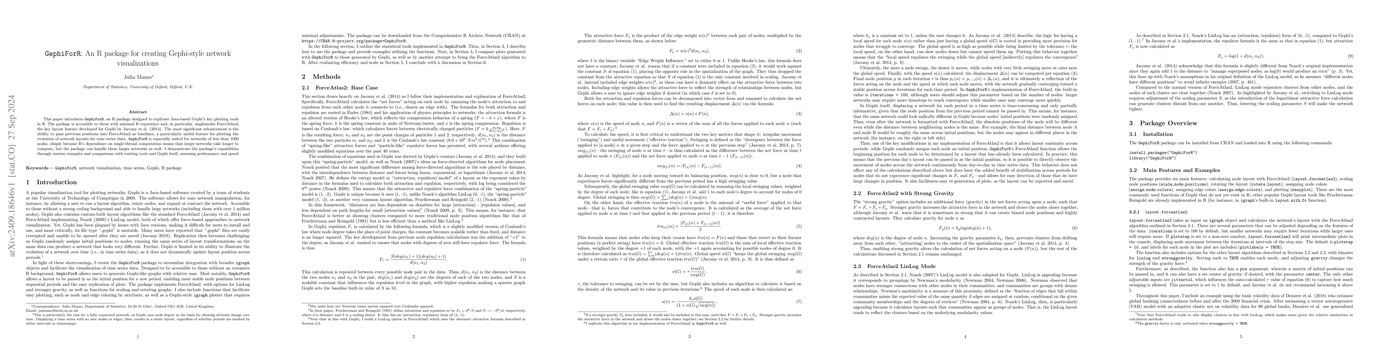 GephiForR is an R package that replicates Gephi's network visualization tools, including the ForceAtlas2 layout algorithm, for users with minimal R experience. It notably allows passing previous layout positions as baselines, ideal for visualizing network evolution over time.