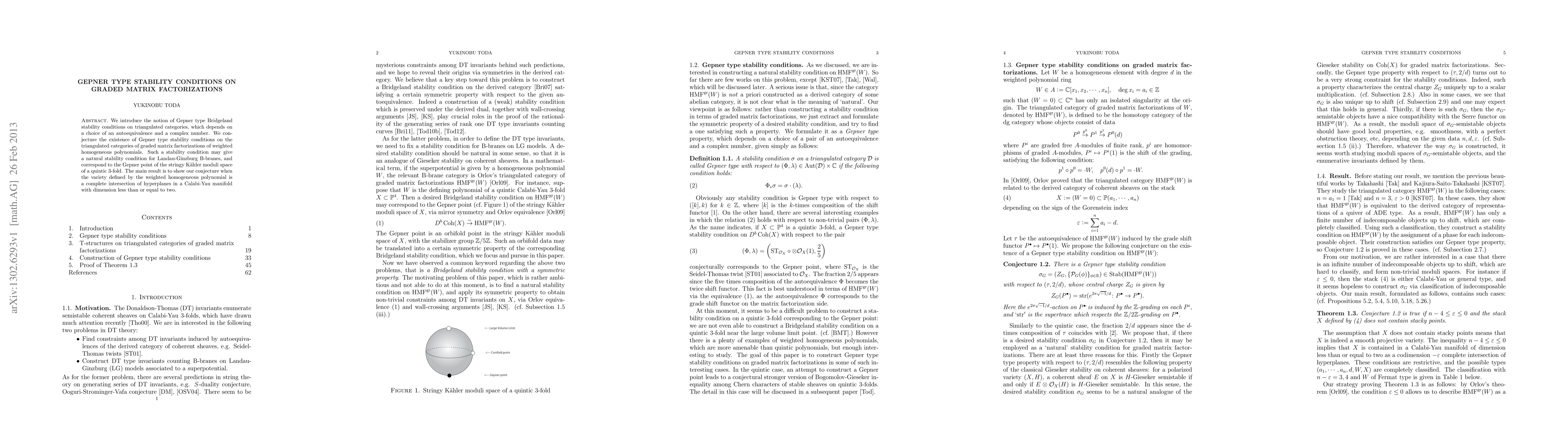 We introduce the notion of Gepner type Bridgeland stability conditions on triangulated categories, which depends on a choice of an autoequivalence and a complex number. We conjecture the existence of Gepner type stability conditions on the triangulated categories of graded matrix factorizations of weighted homogeneous polynomials. Such a stability condition may give a natural stability condition for Landau-Ginzburg B-branes, and correspond to the Gepner point of the stringy Kahler moduli space of a quintic 3-fold. The main result is to show our conjecture when the variety defined by the weighted homogeneous polynomial is a complete intersection of hyperplanes in a Calabi-Yau manifold with dimension less than or equal to two.